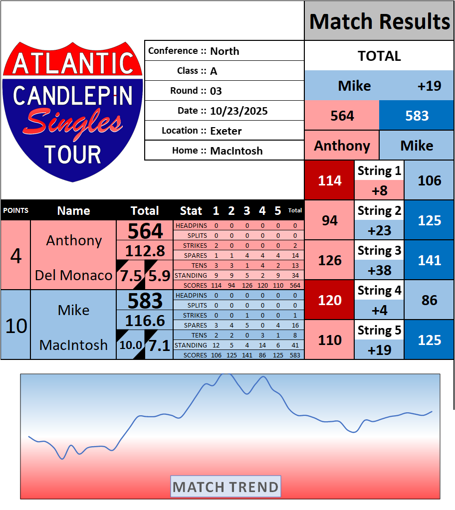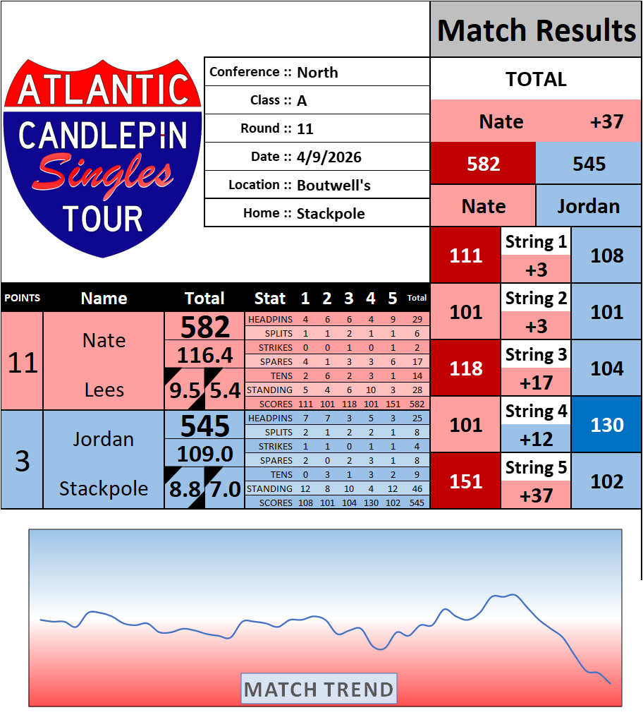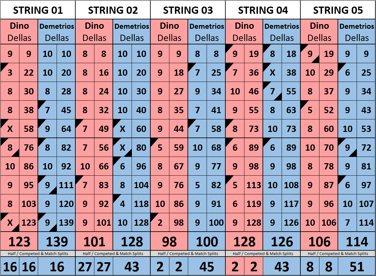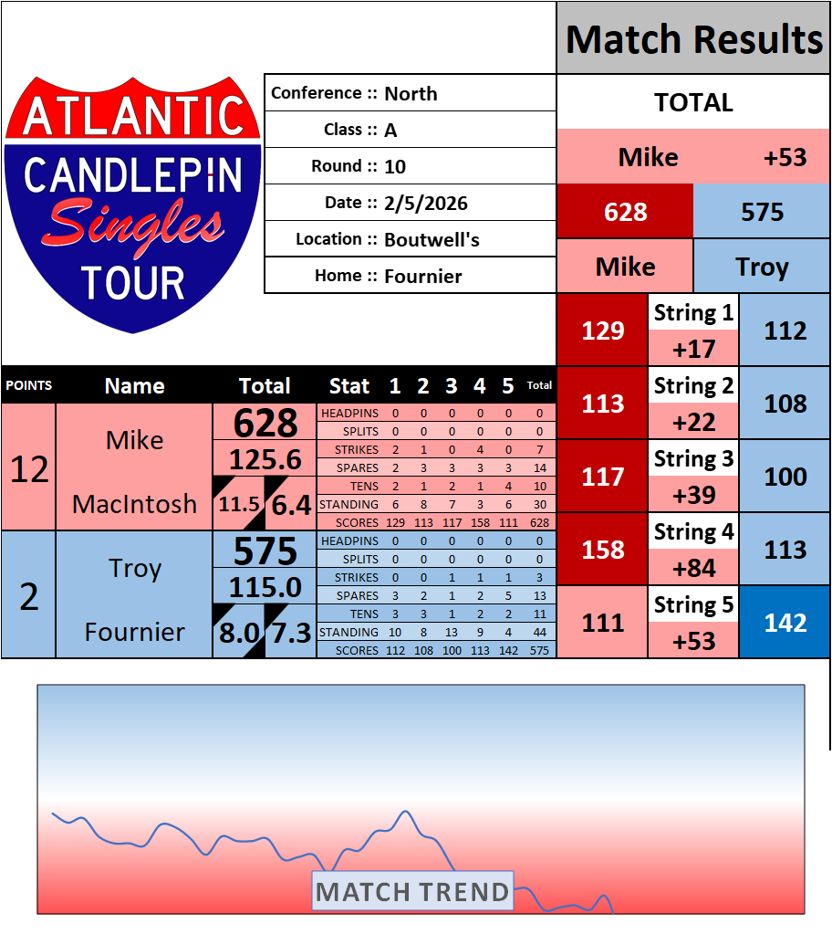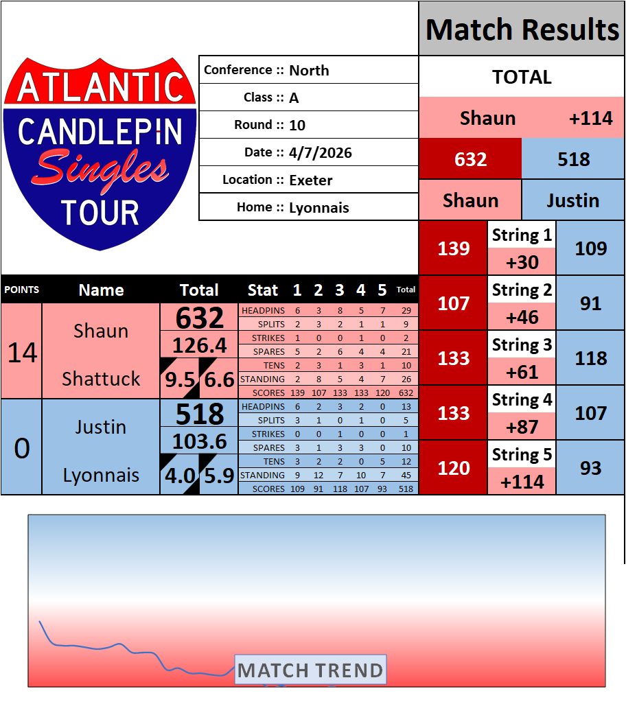 Browse the folder structure below to see all of the scoresheets – each is presented as two files, -1 and -2 where -1 is the Match Summary and -2 is the Scoresheet. All matches are separated by conference (North, South, West), and class (A, B, C, D, E). They are then sorted by Round # and named after the Home Bowler.