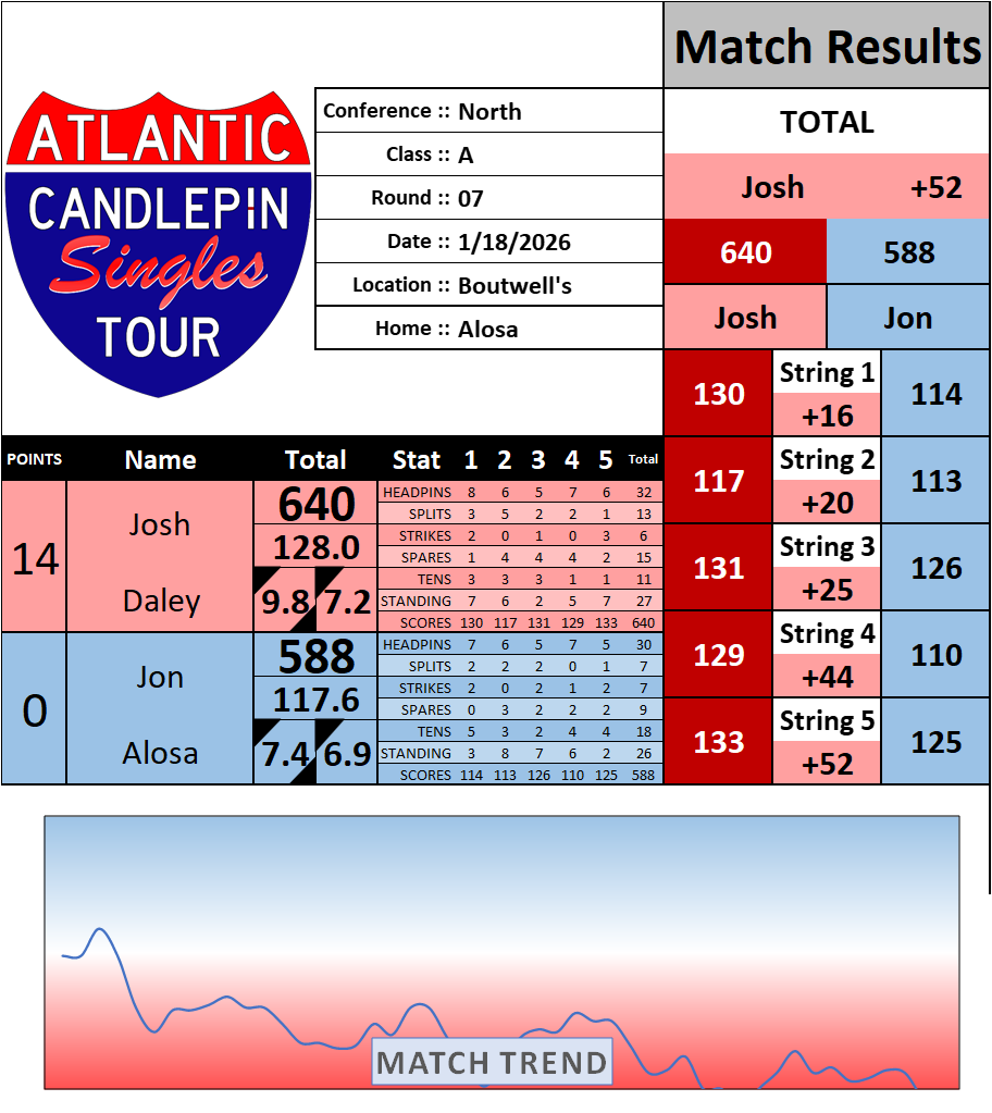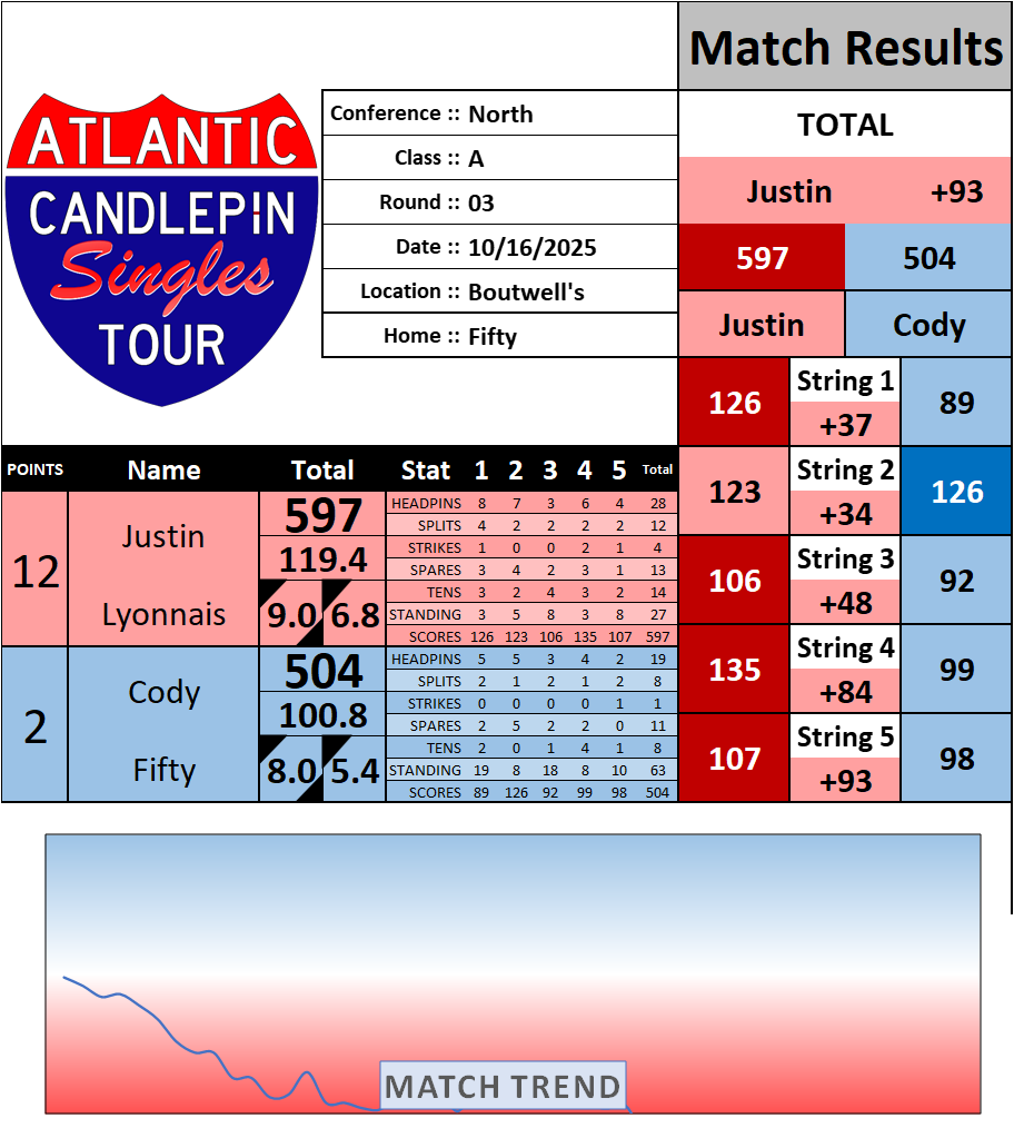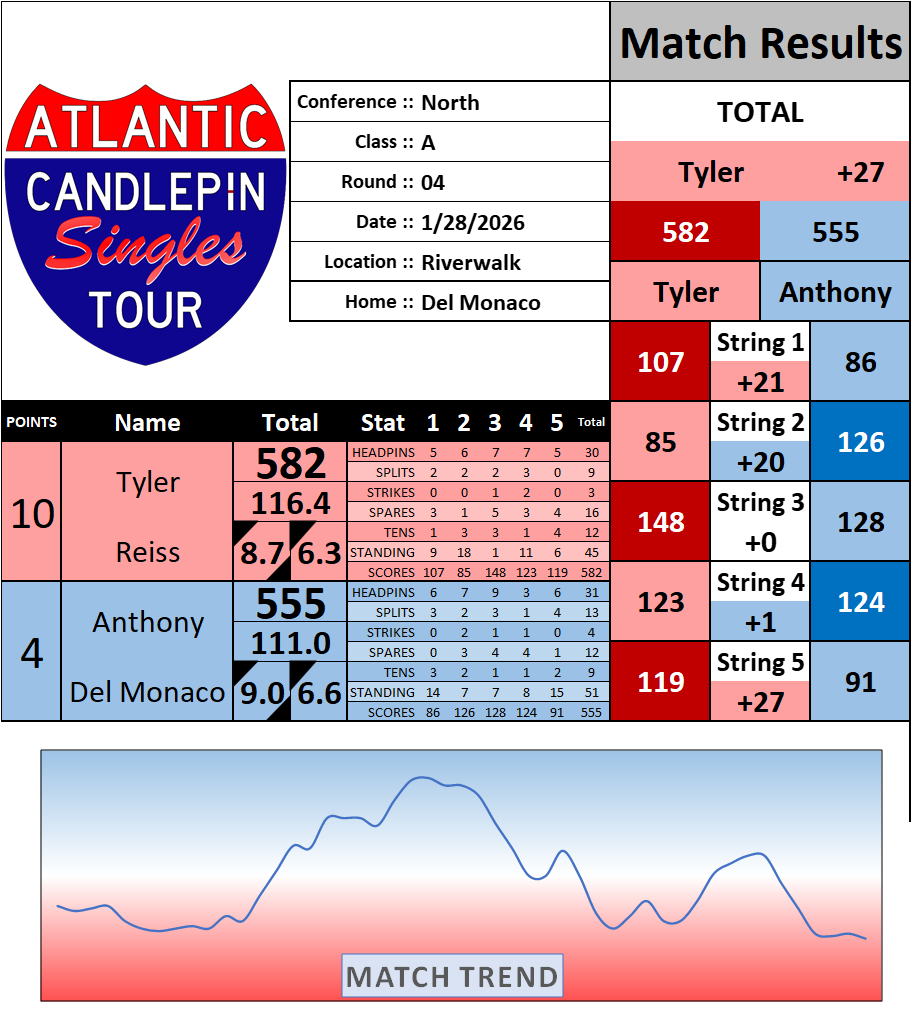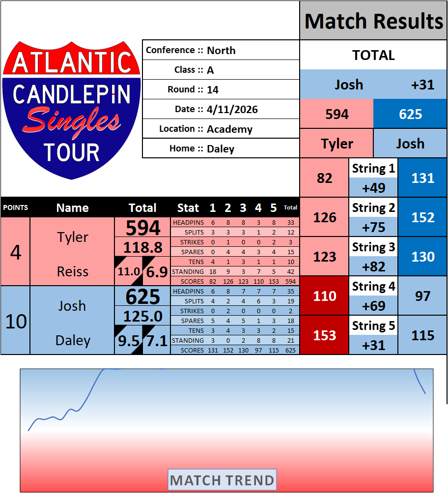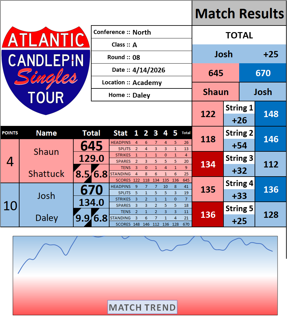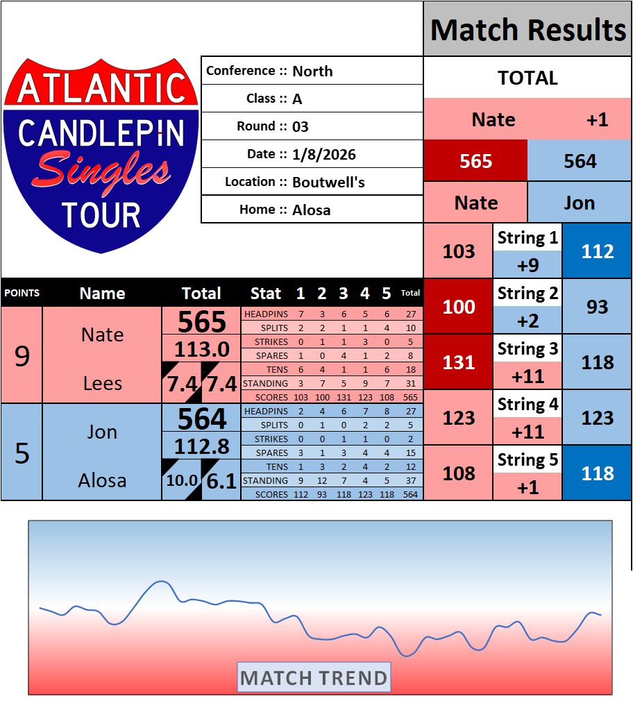 Browse the folder structure below to see all of the scoresheets – each is presented as two files, -1 and -2 where -1 is the Match Summary and -2 is the Scoresheet. All matches are separated by conference (North, South, West), and class (A, B, C, D, E). They are then sorted by Round # and named after the Home Bowler.