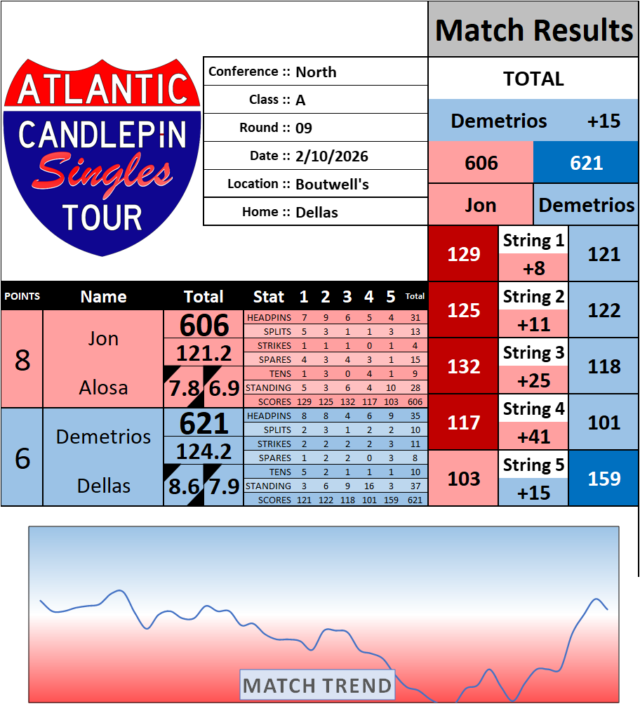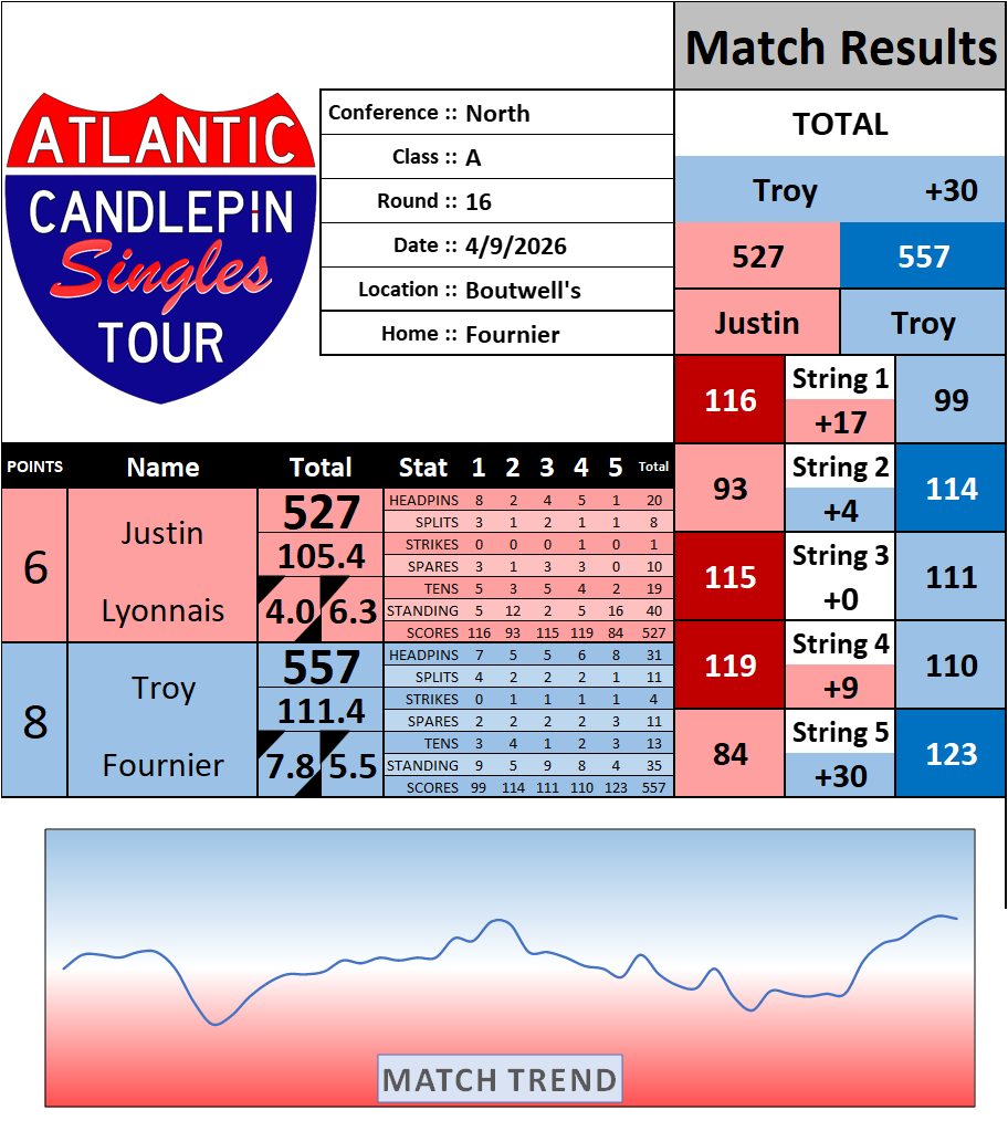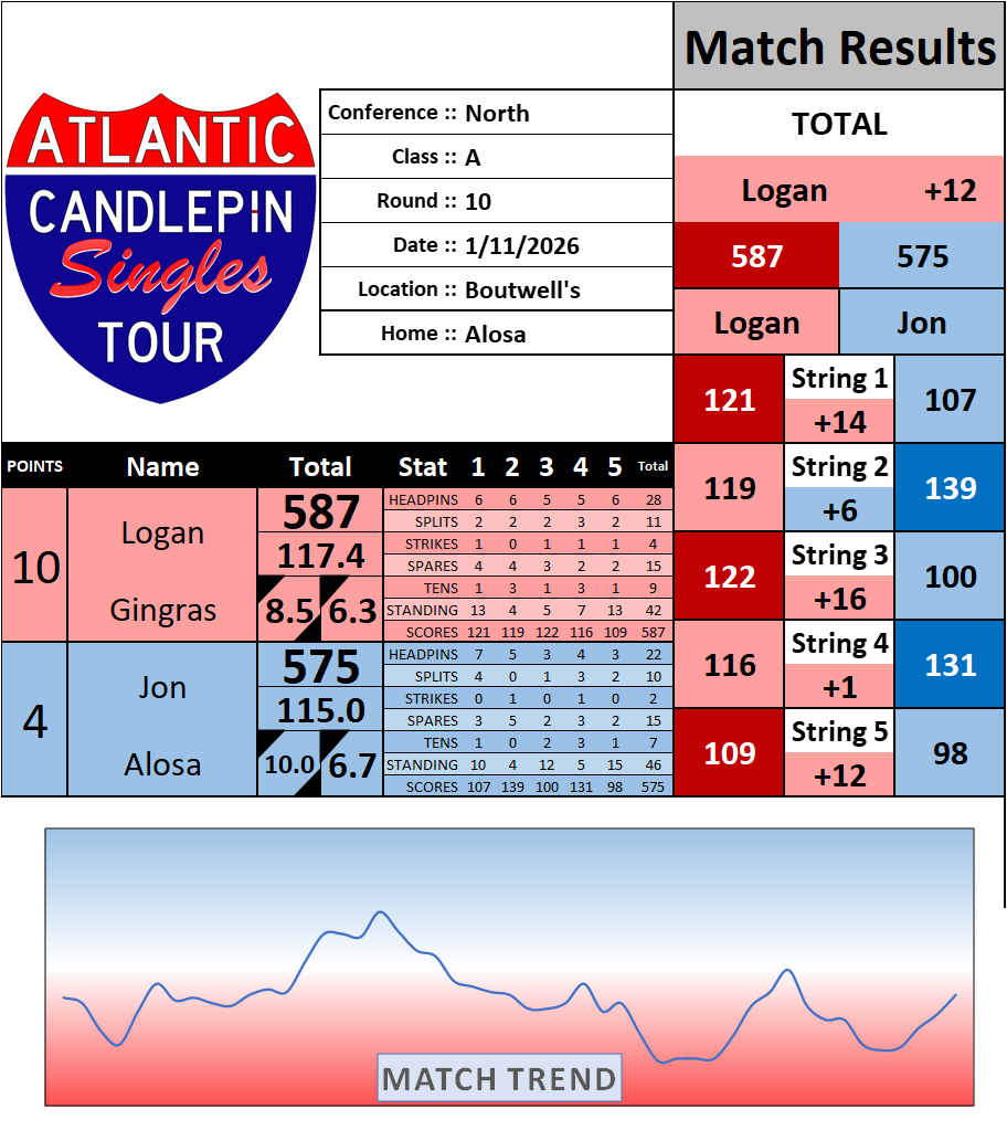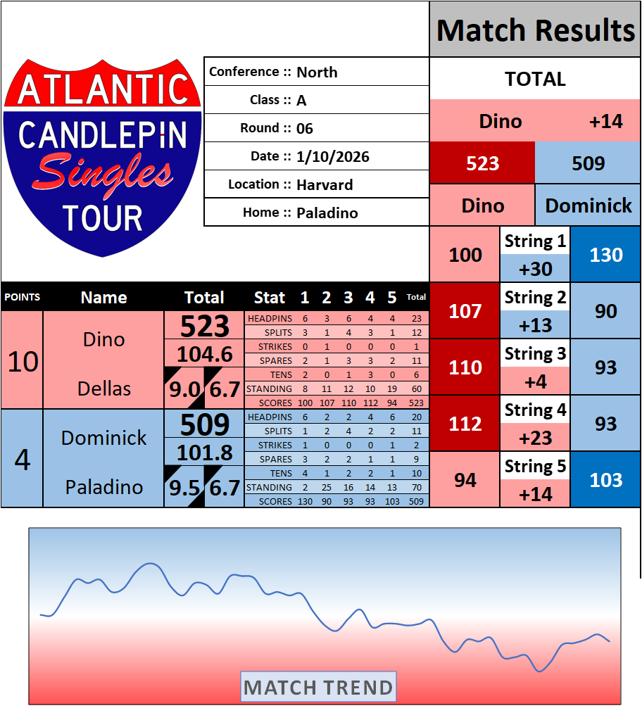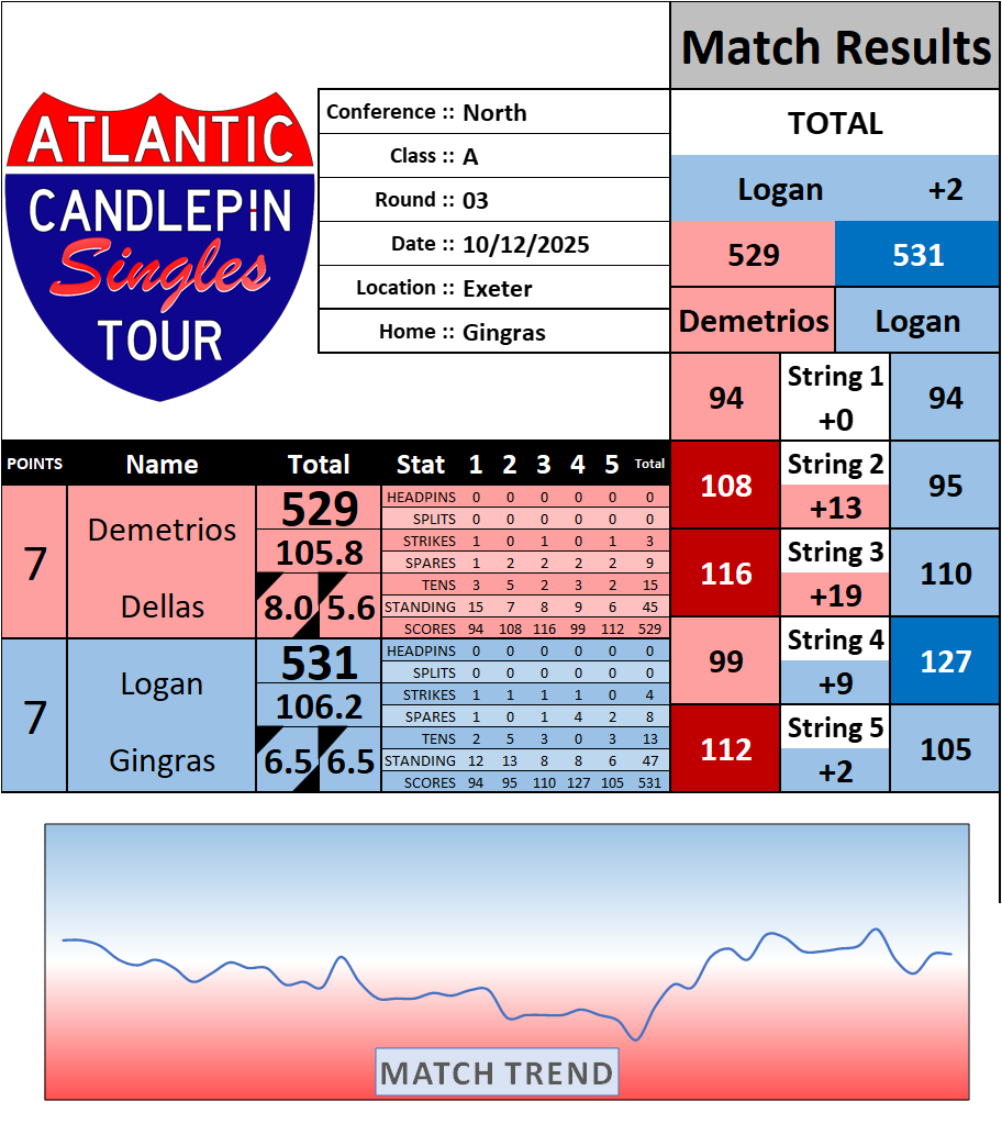 Browse the folder structure below to see all of the scoresheets – each is presented as two files, -1 and -2 where -1 is the Match Summary and -2 is the Scoresheet. All matches are separated by conference (North, South, West), and class (A, B, C, D, E). They are then sorted by Round # and named after the Home Bowler.