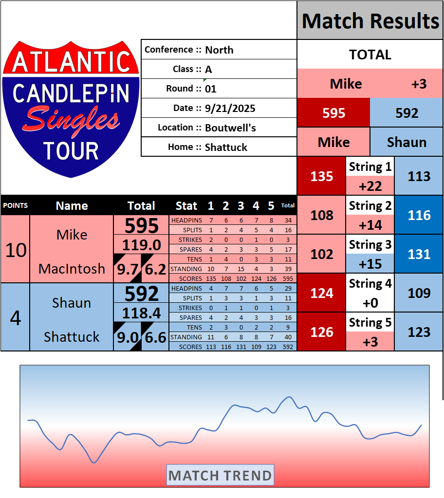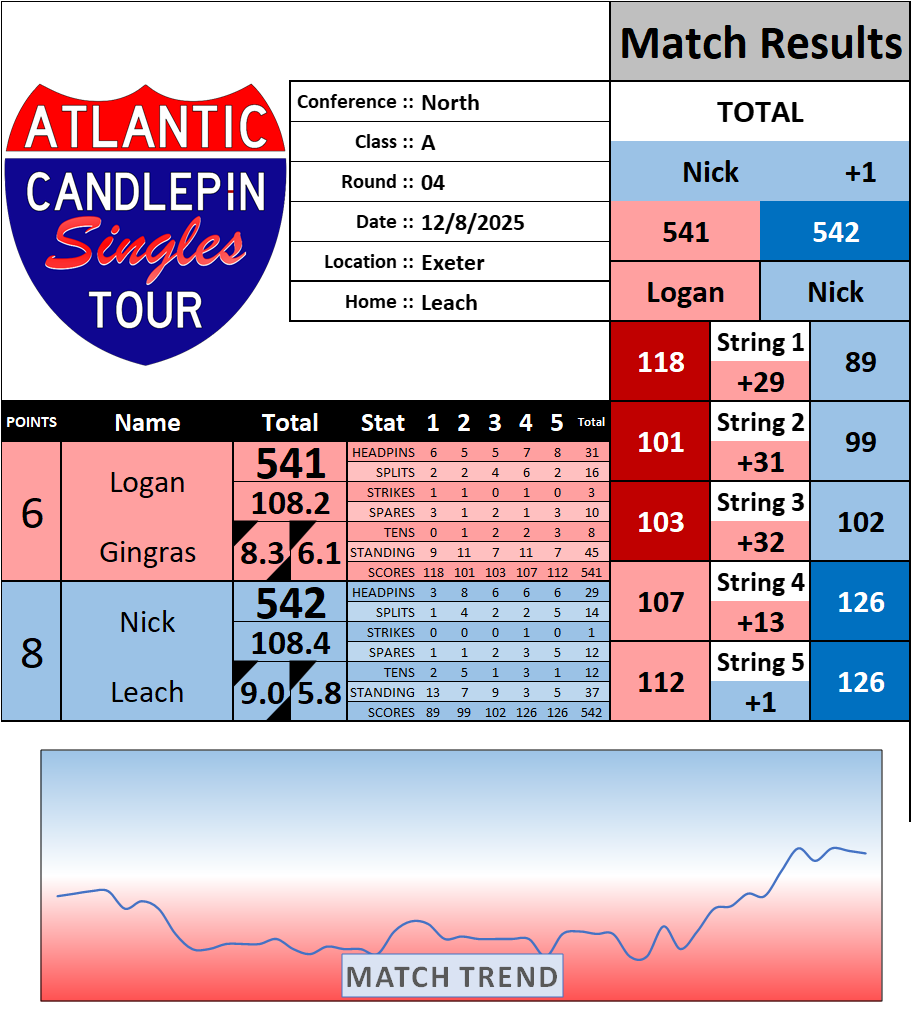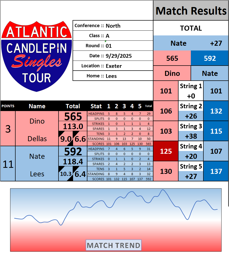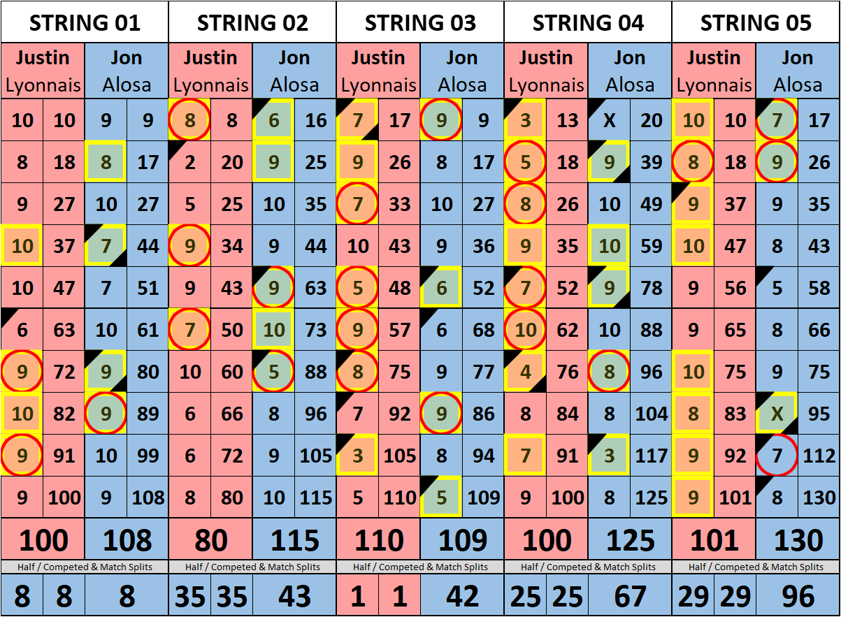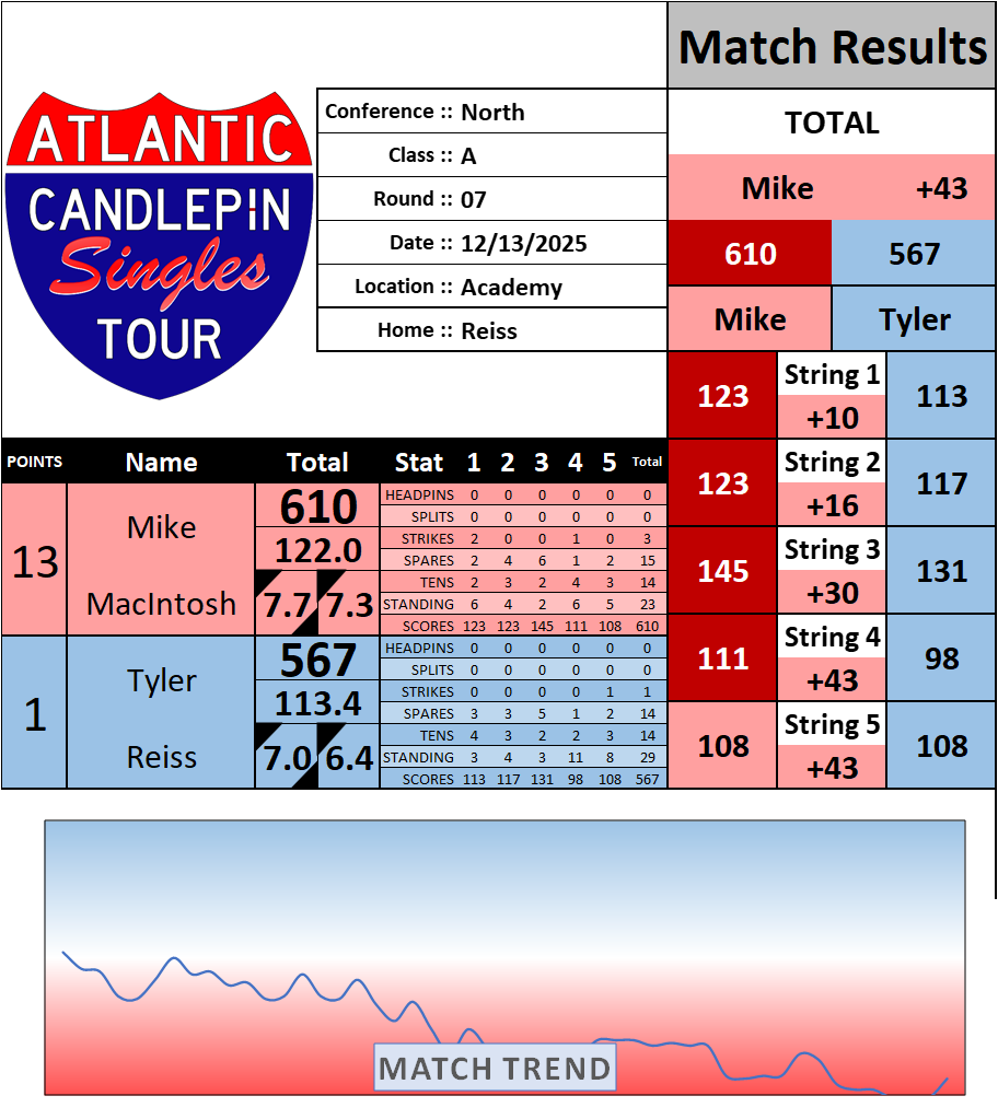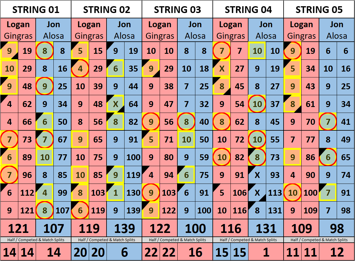 Browse the folder structure below to see all of the scoresheets – each is presented as two files, -1 and -2 where -1 is the Match Summary and -2 is the Scoresheet. All matches are separated by conference (North, South, West), and class (A, B, C, D, E). They are then sorted by Round # and named after the Home Bowler.