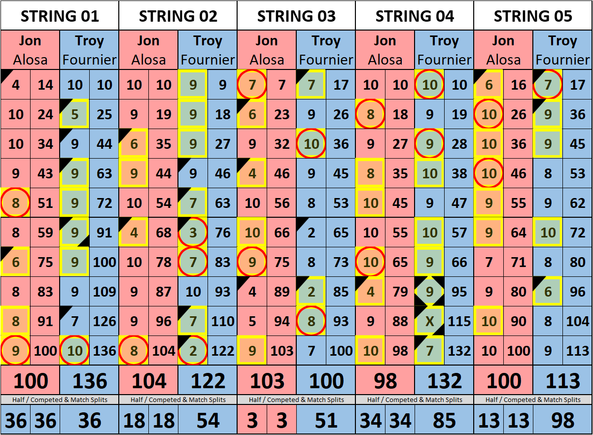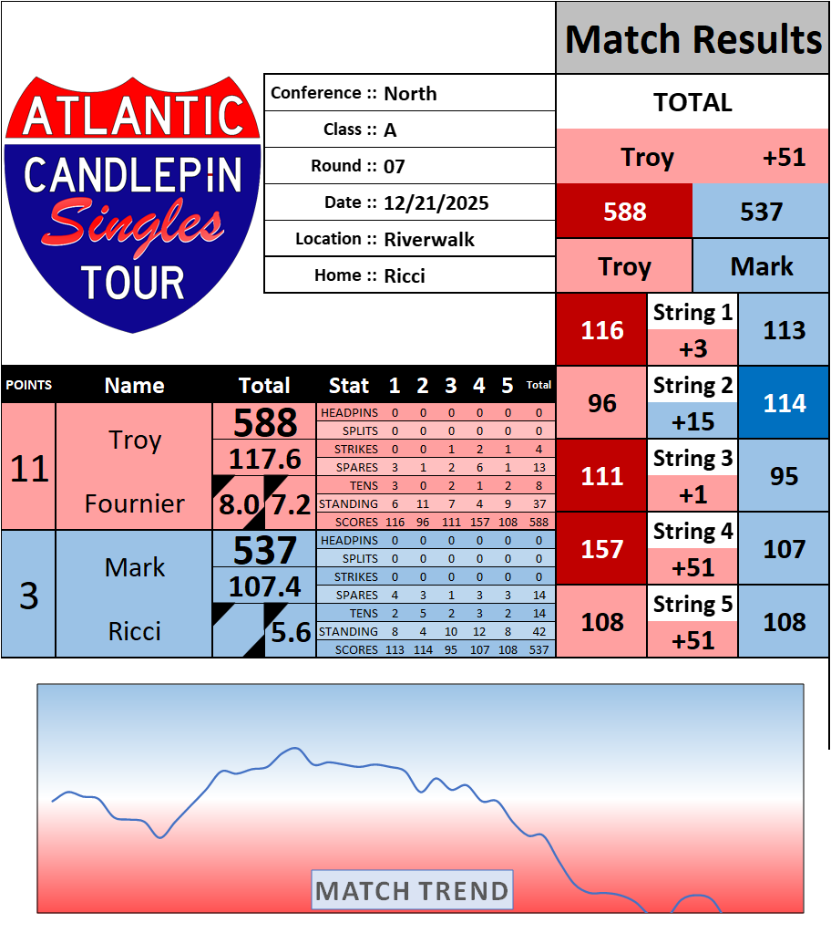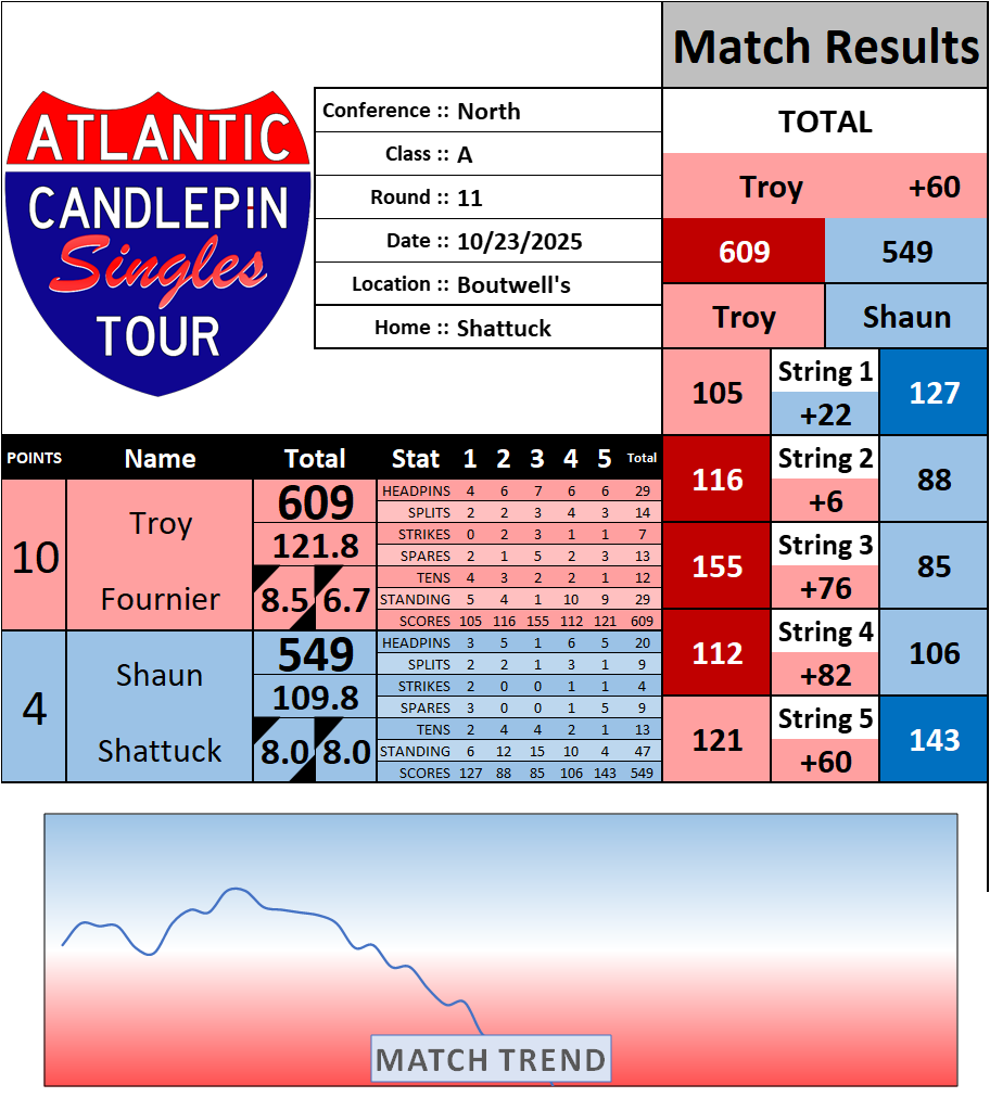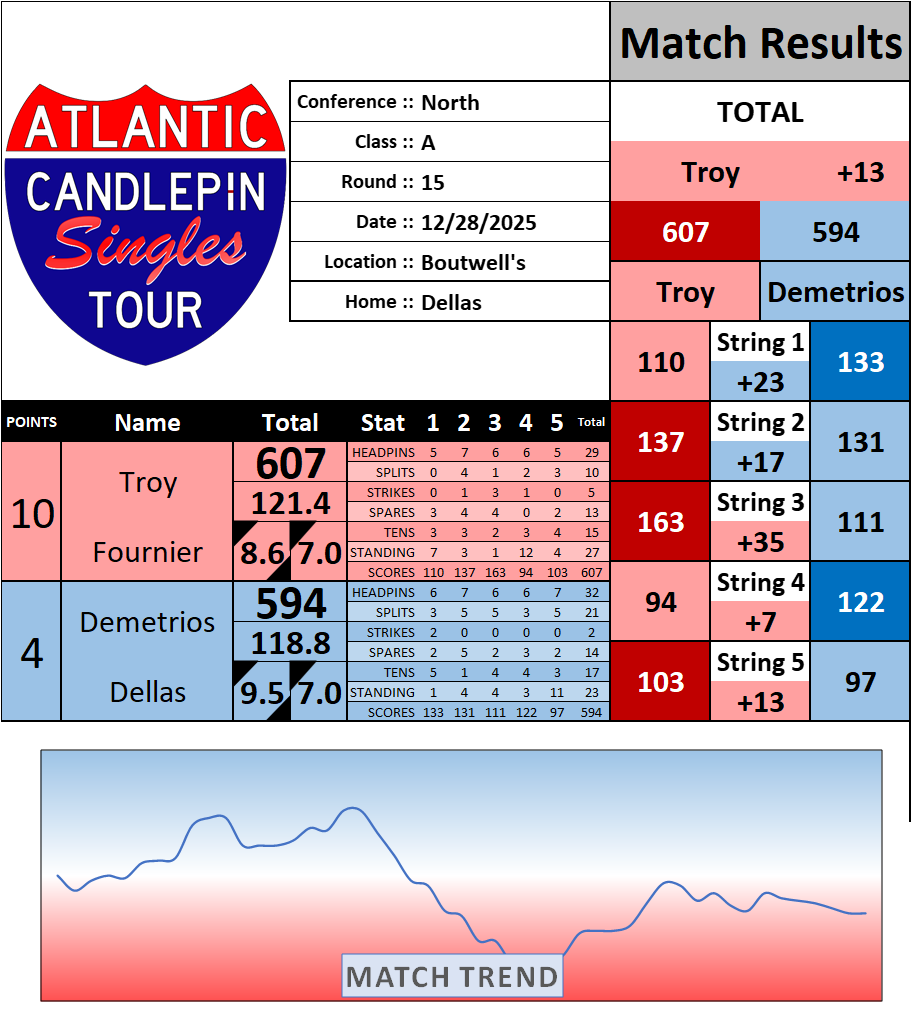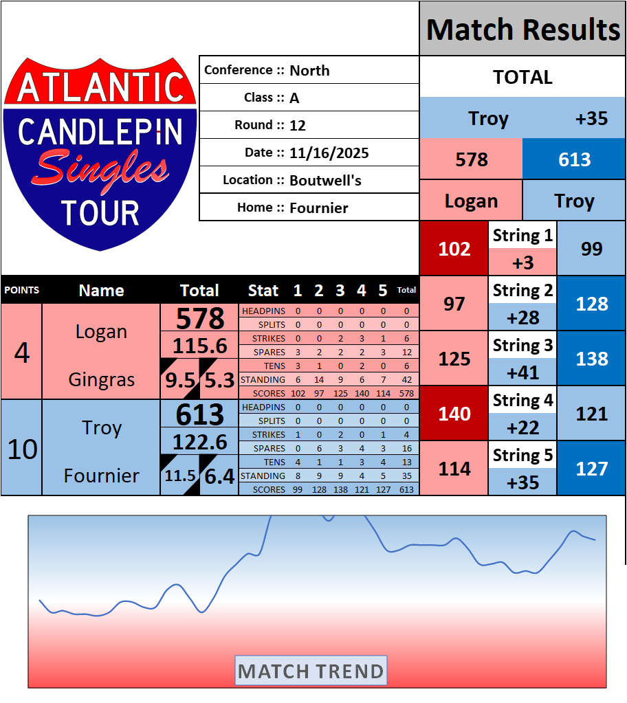 Browse the folder structure below to see all of the scoresheets – each is presented as two files, -1 and -2 where -1 is the Match Summary and -2 is the Scoresheet. All matches are separated by conference (North, South, West), and class (A, B, C, D, E). They are then sorted by Round # and named after the Home Bowler.