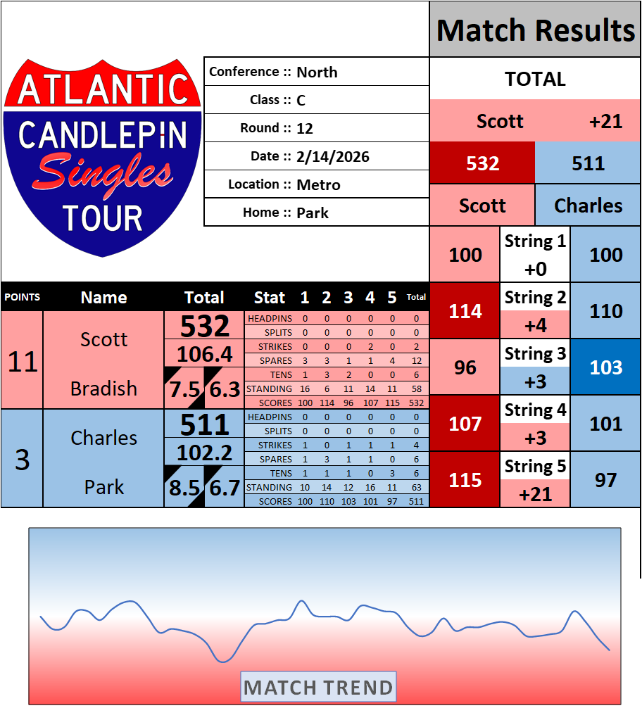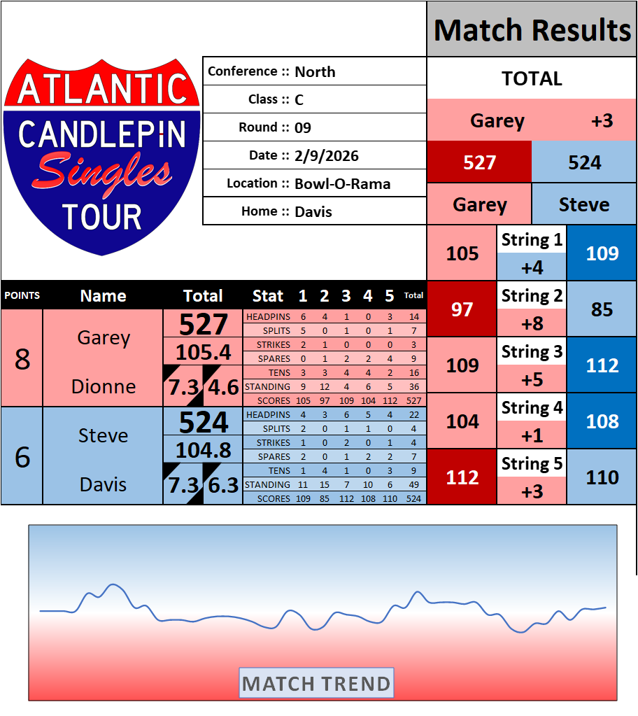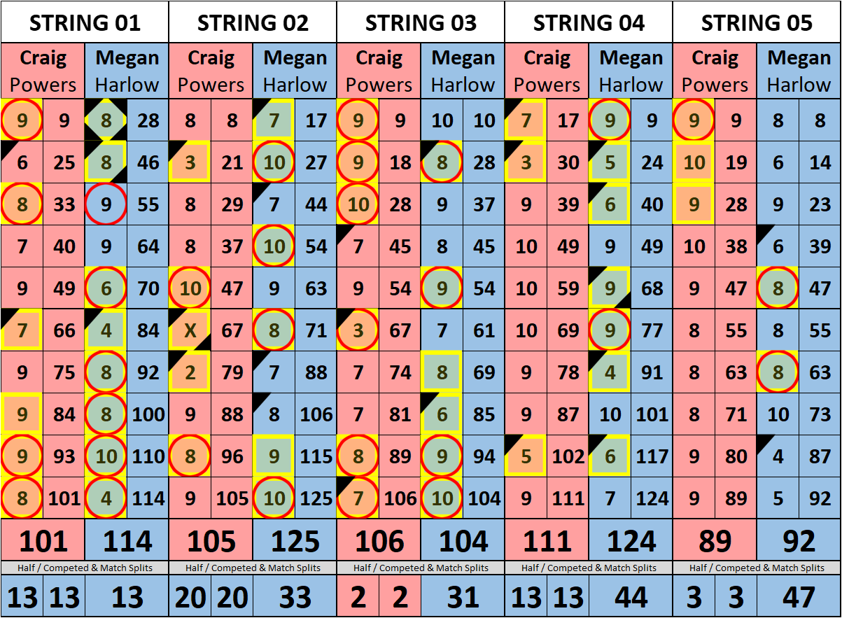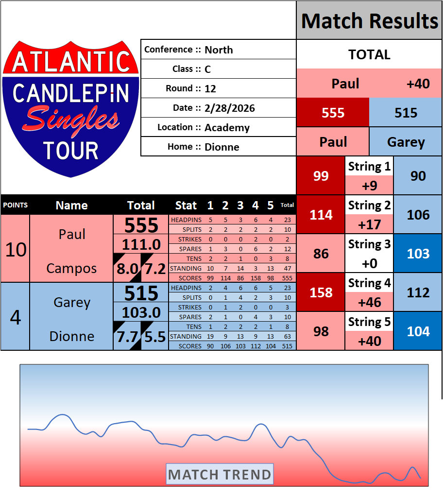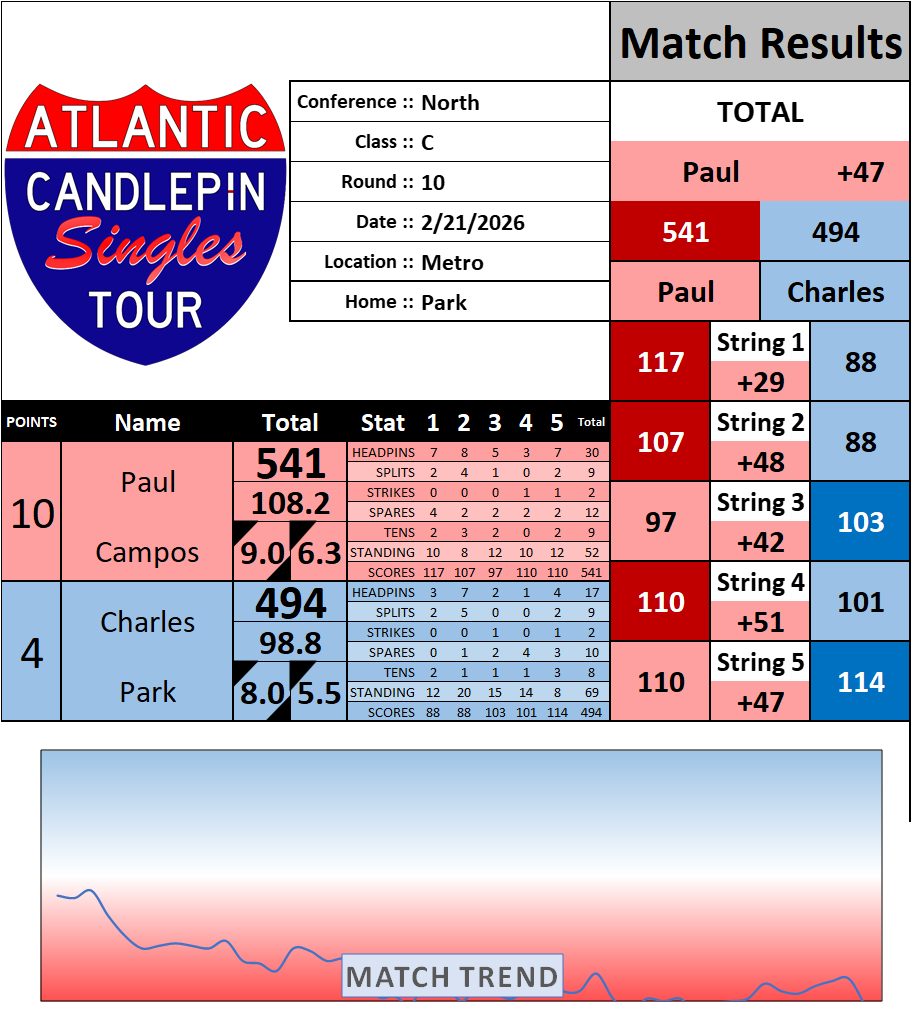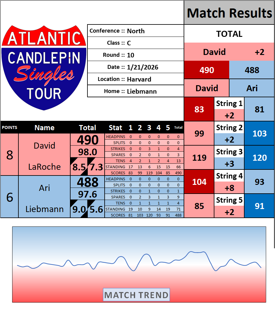 Browse the folder structure below to see all of the scoresheets – each is presented as two files, -1 and -2 where -1 is the Match Summary and -2 is the Scoresheet. All matches are separated by conference (North, South, West), and class (A, B, C, D, E). They are then sorted by Round # and named after the Home Bowler.
