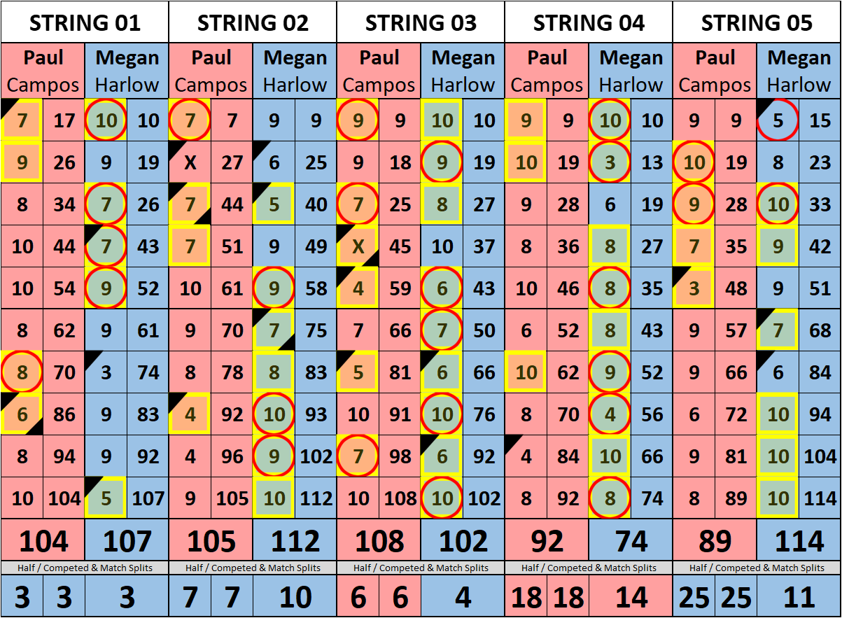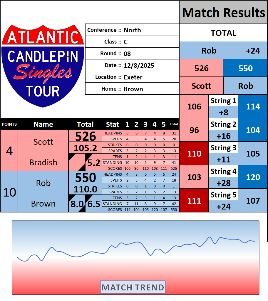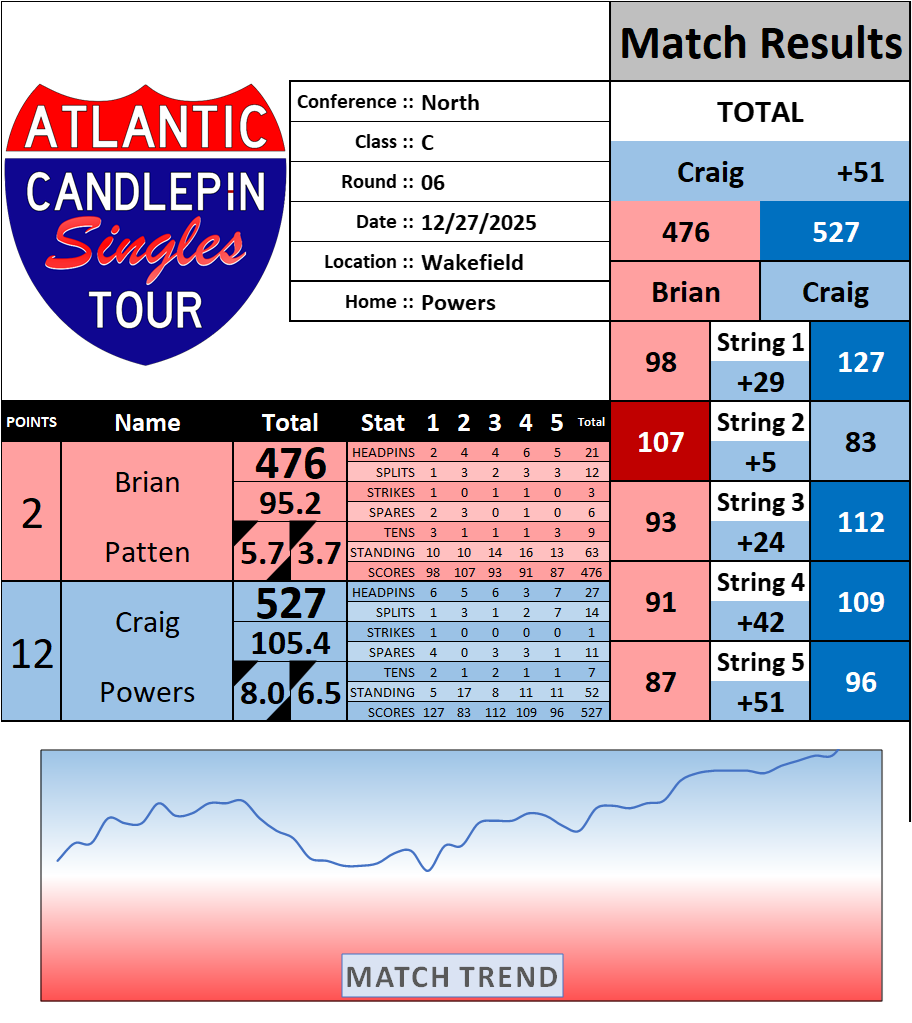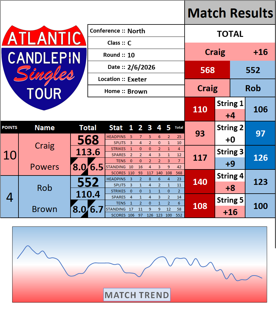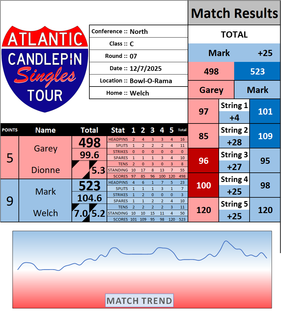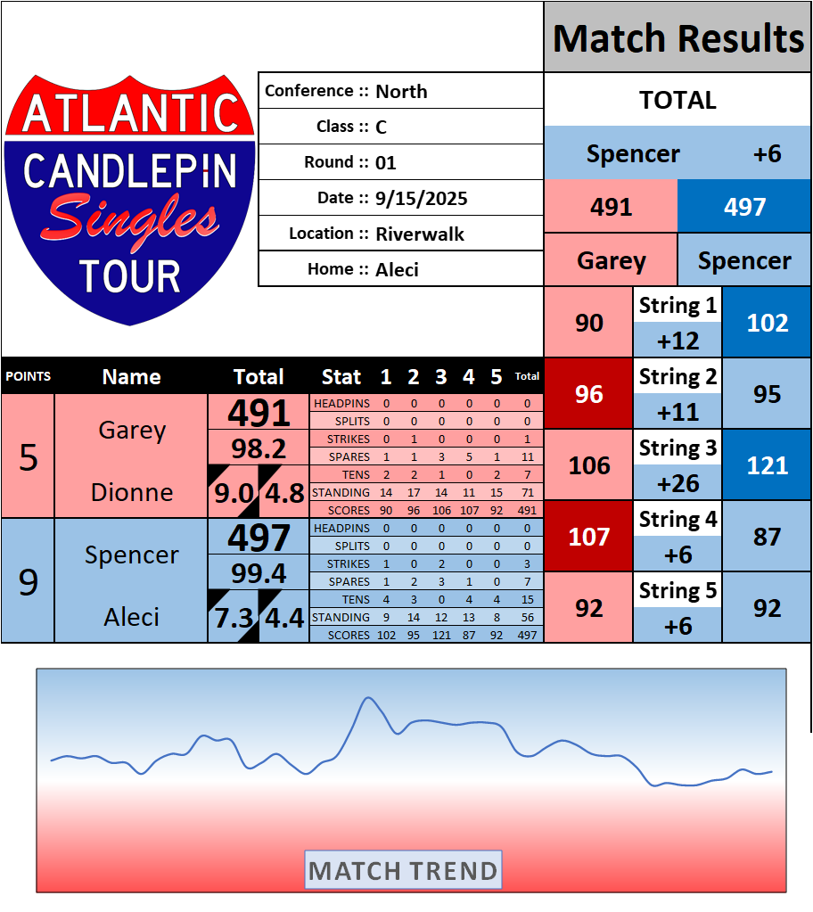 Browse the folder structure below to see all of the scoresheets – each is presented as two files, -1 and -2 where -1 is the Match Summary and -2 is the Scoresheet. All matches are separated by conference (North, South, West), and class (A, B, C, D, E). They are then sorted by Round # and named after the Home Bowler.