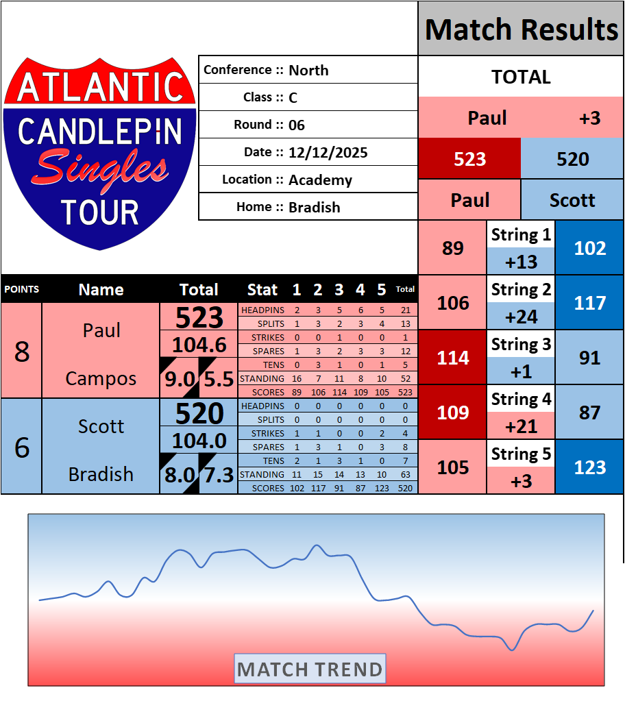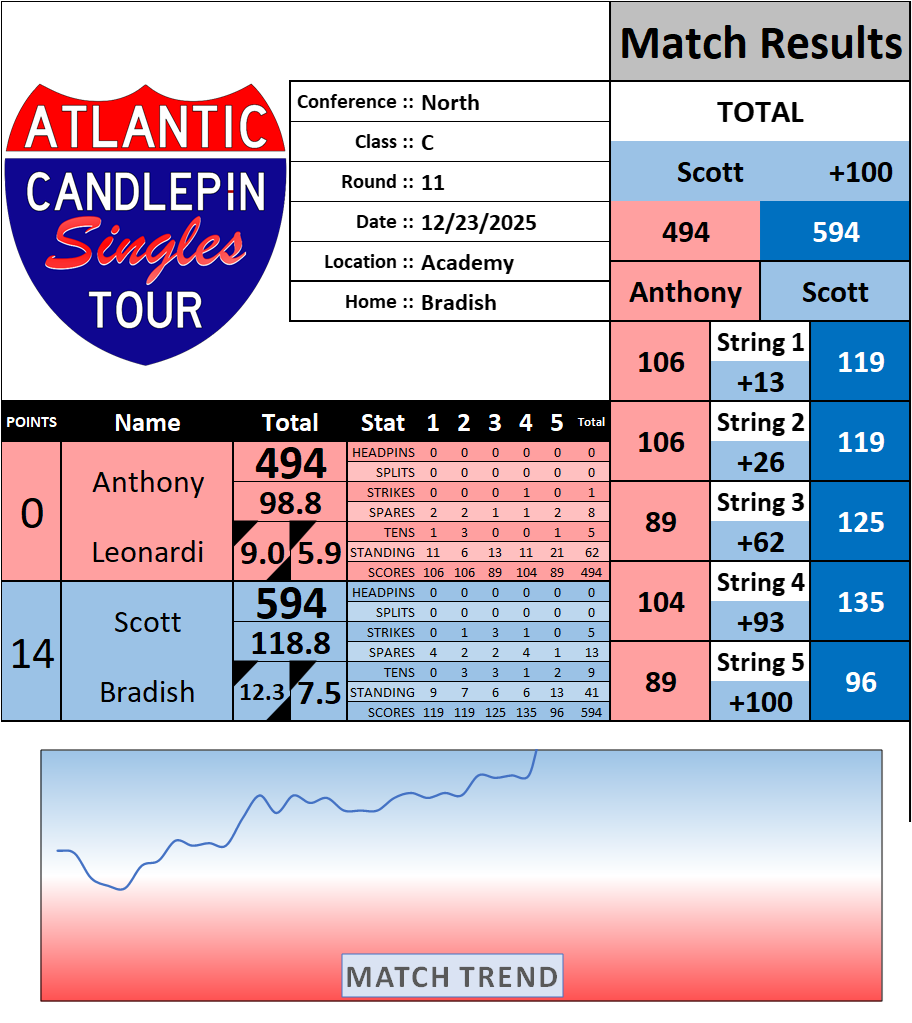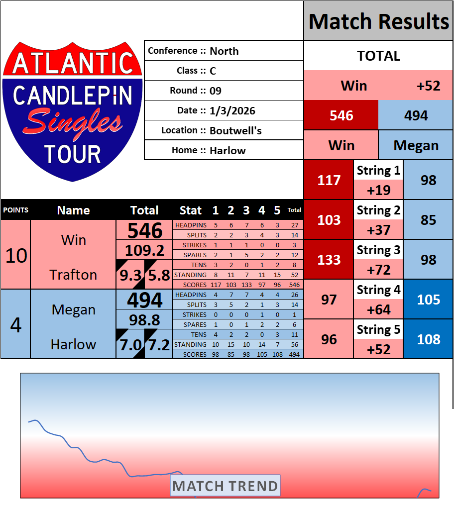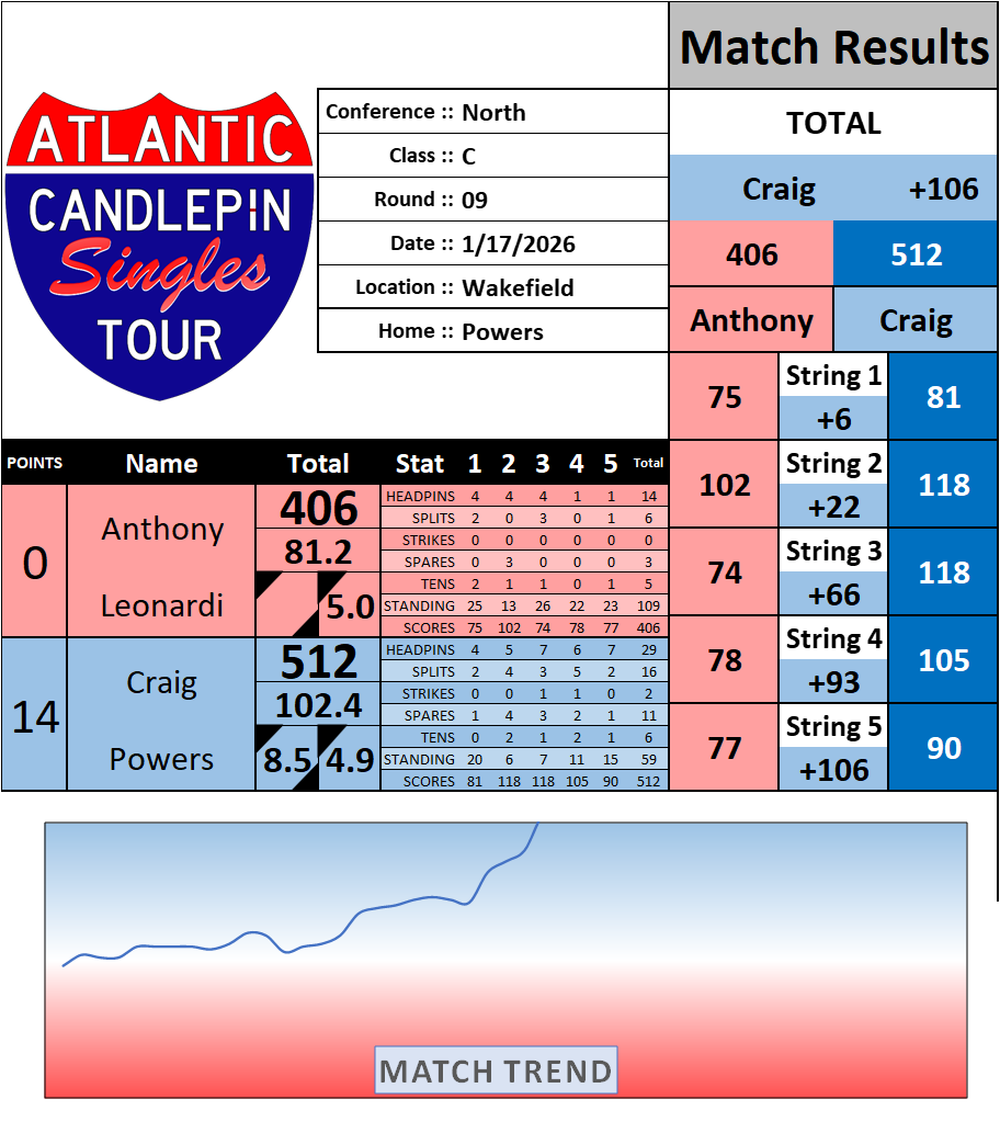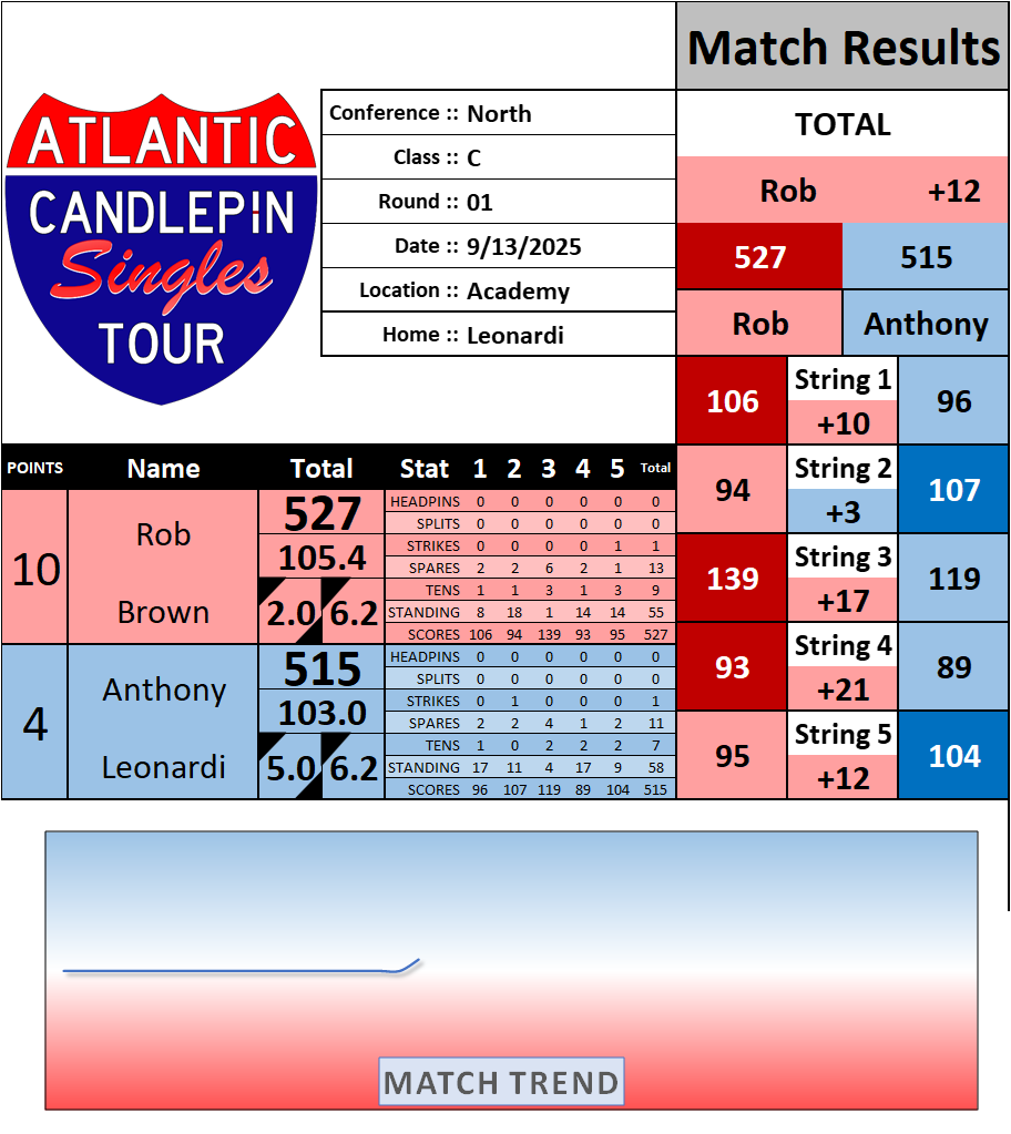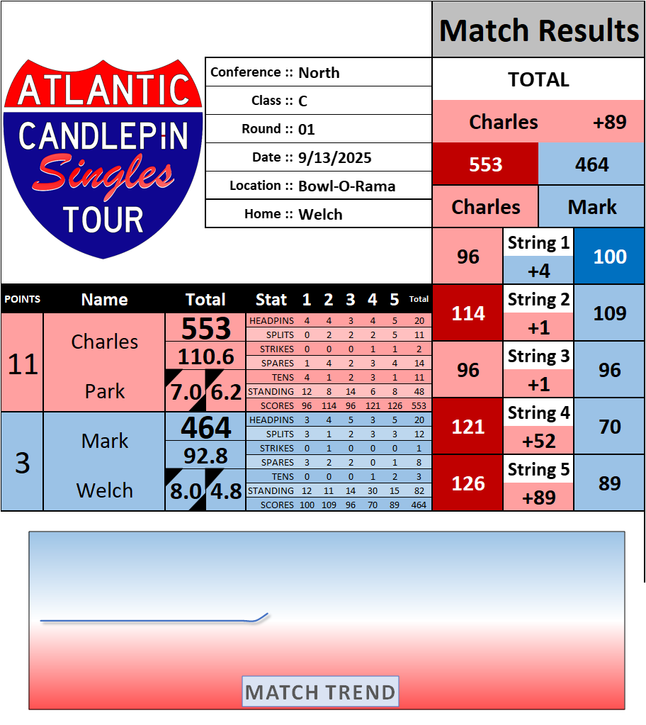 Browse the folder structure below to see all of the scoresheets – each is presented as two files, -1 and -2 where -1 is the Match Summary and -2 is the Scoresheet. All matches are separated by conference (North, South, West), and class (A, B, C, D, E). They are then sorted by Round # and named after the Home Bowler.