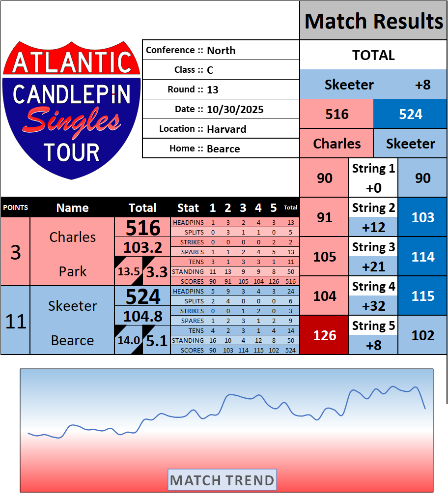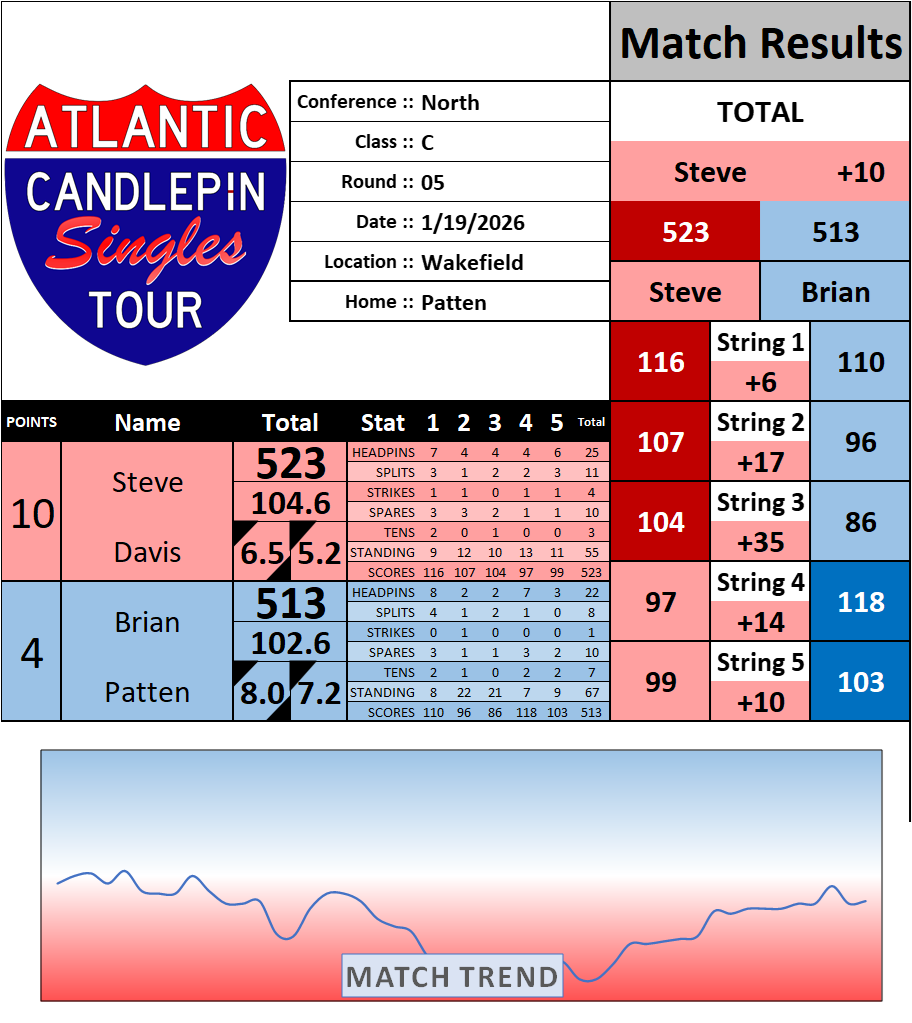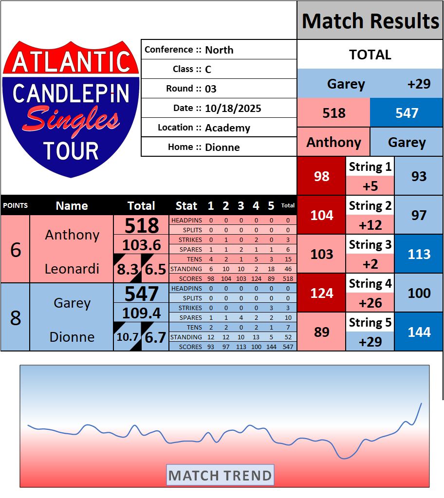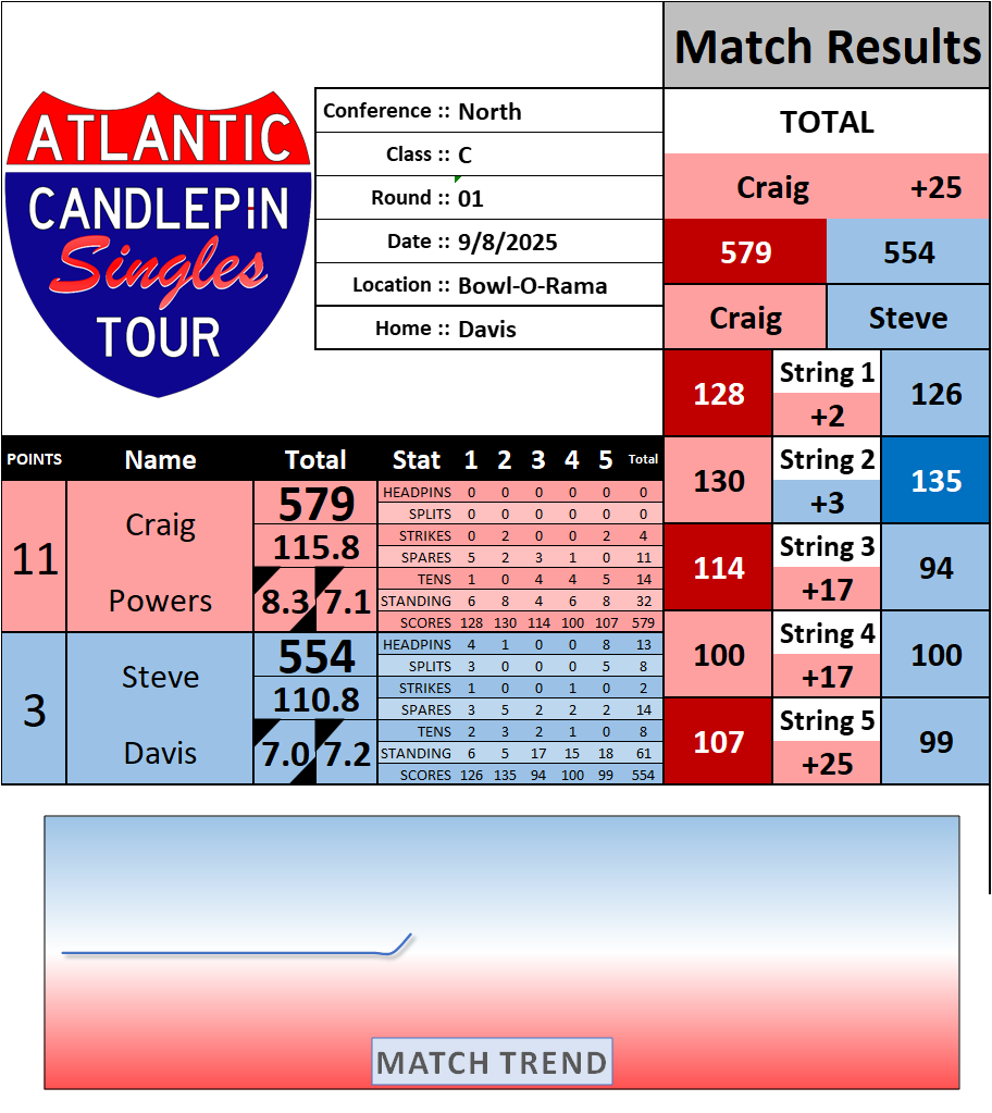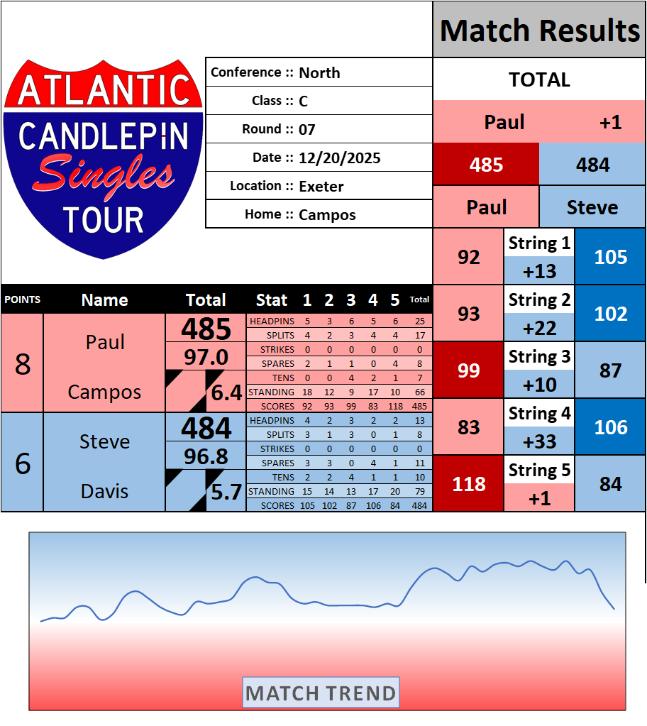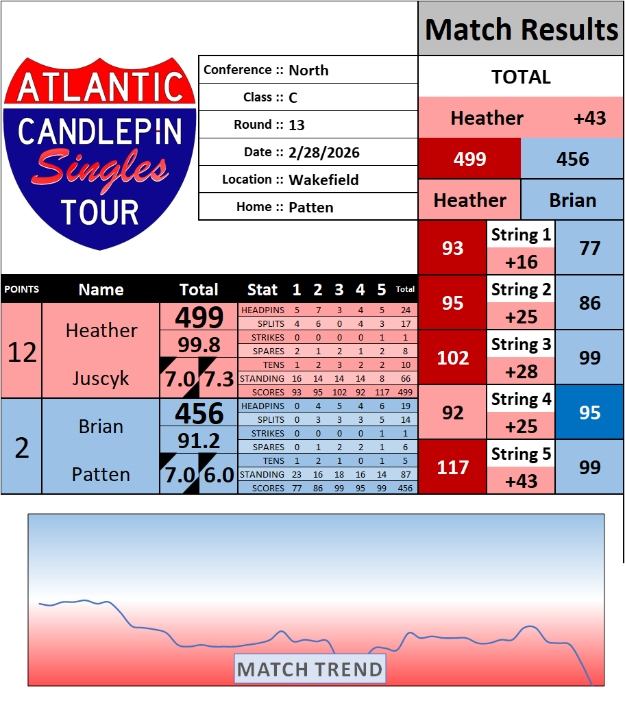 Browse the folder structure below to see all of the scoresheets – each is presented as two files, -1 and -2 where -1 is the Match Summary and -2 is the Scoresheet. All matches are separated by conference (North, South, West), and class (A, B, C, D, E). They are then sorted by Round # and named after the Home Bowler.