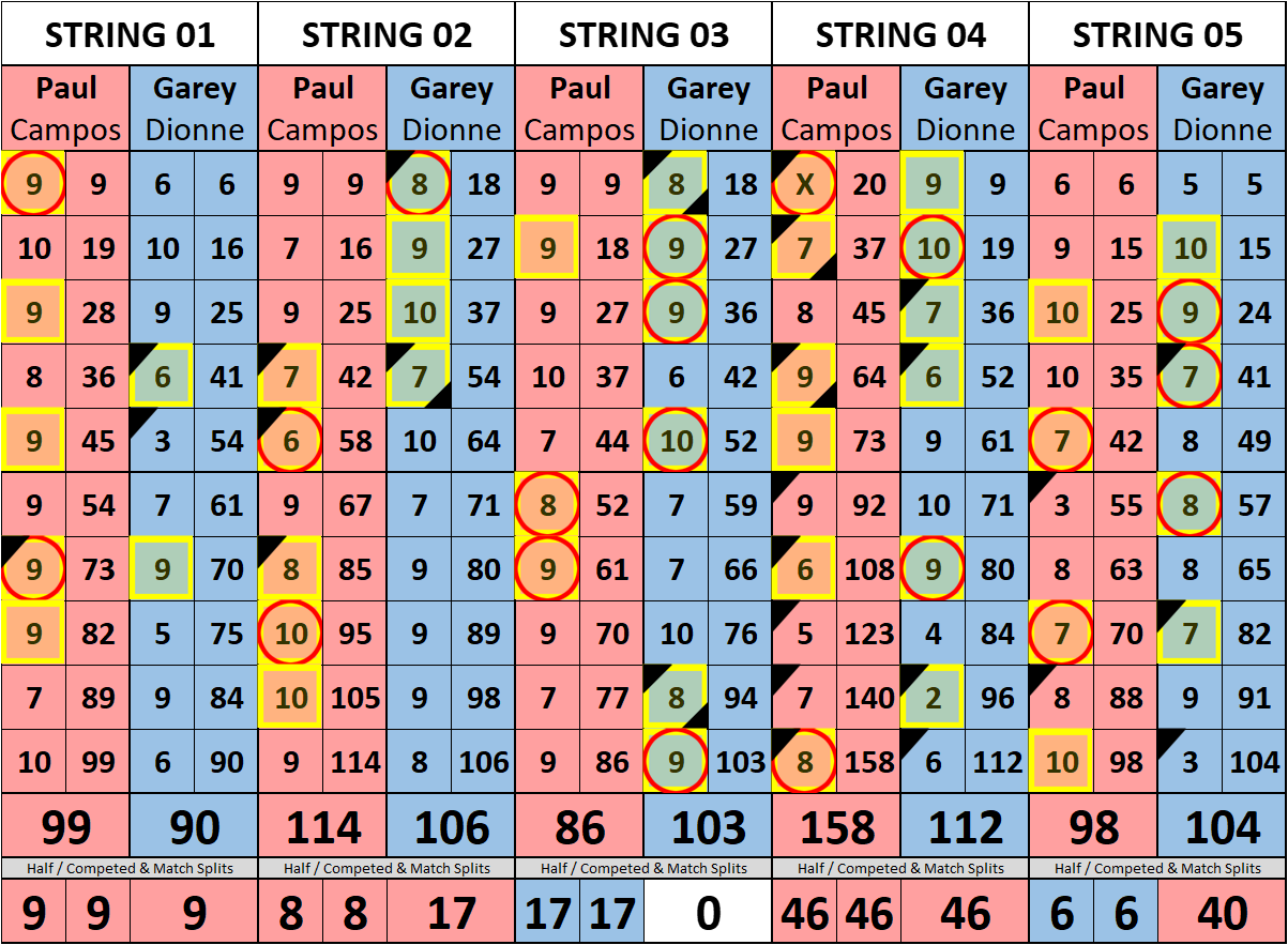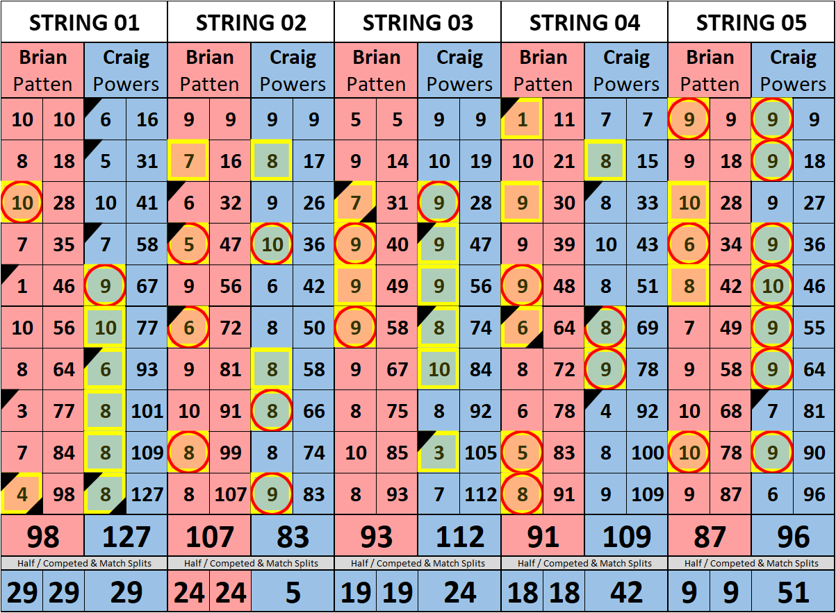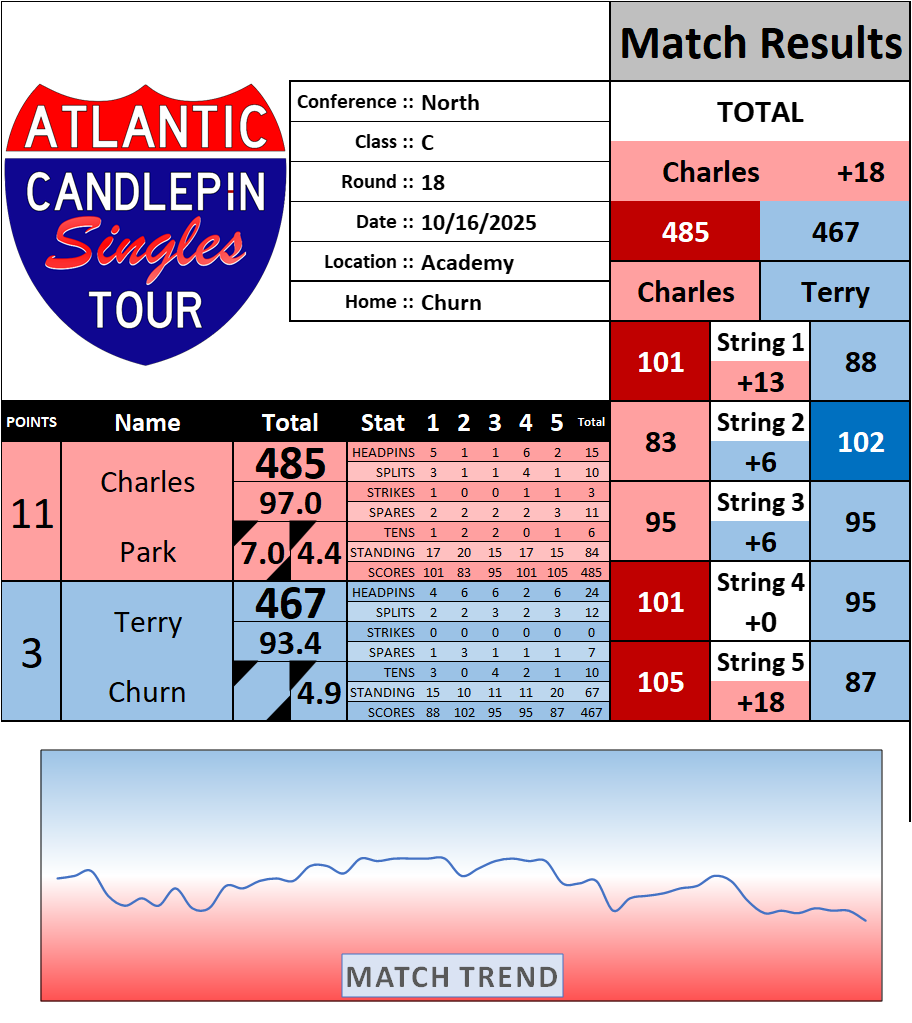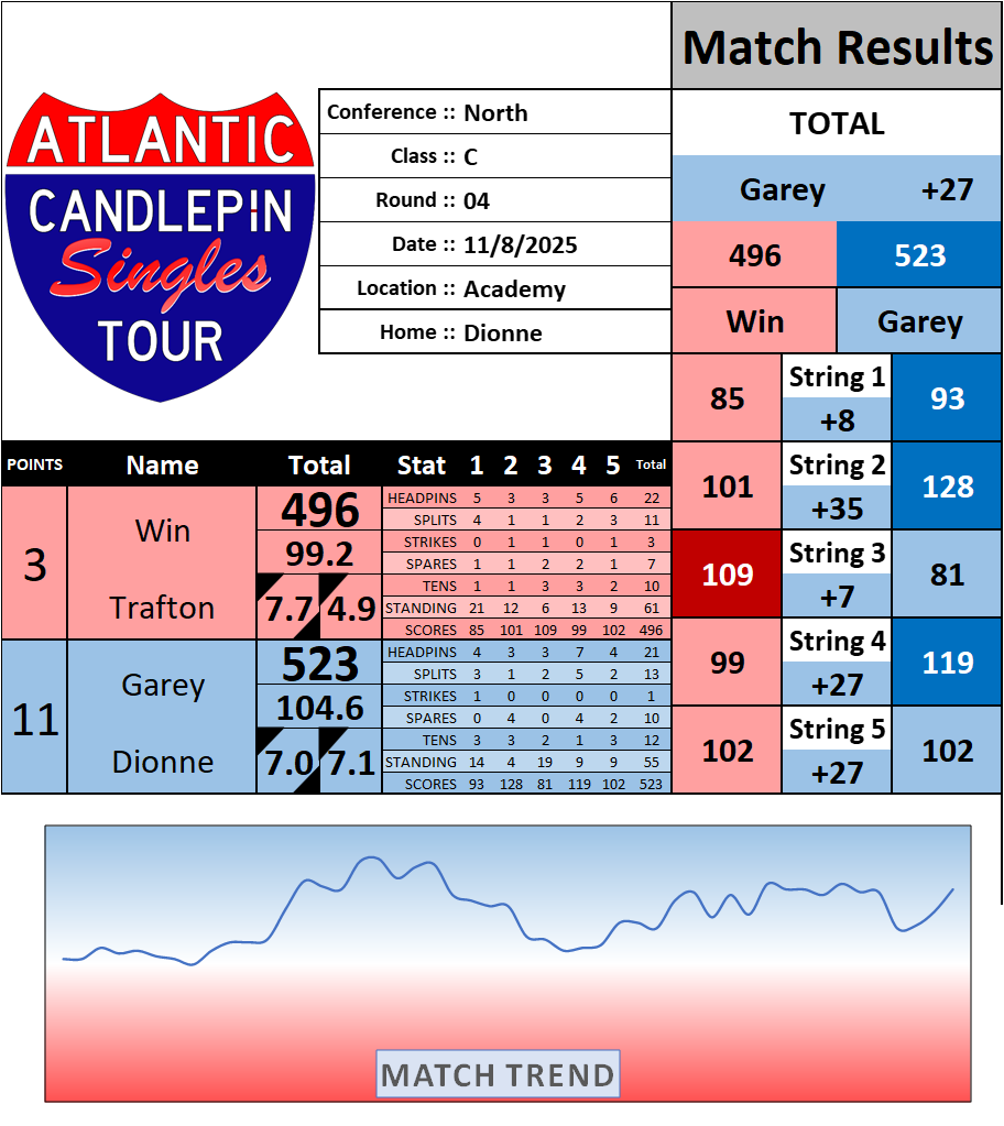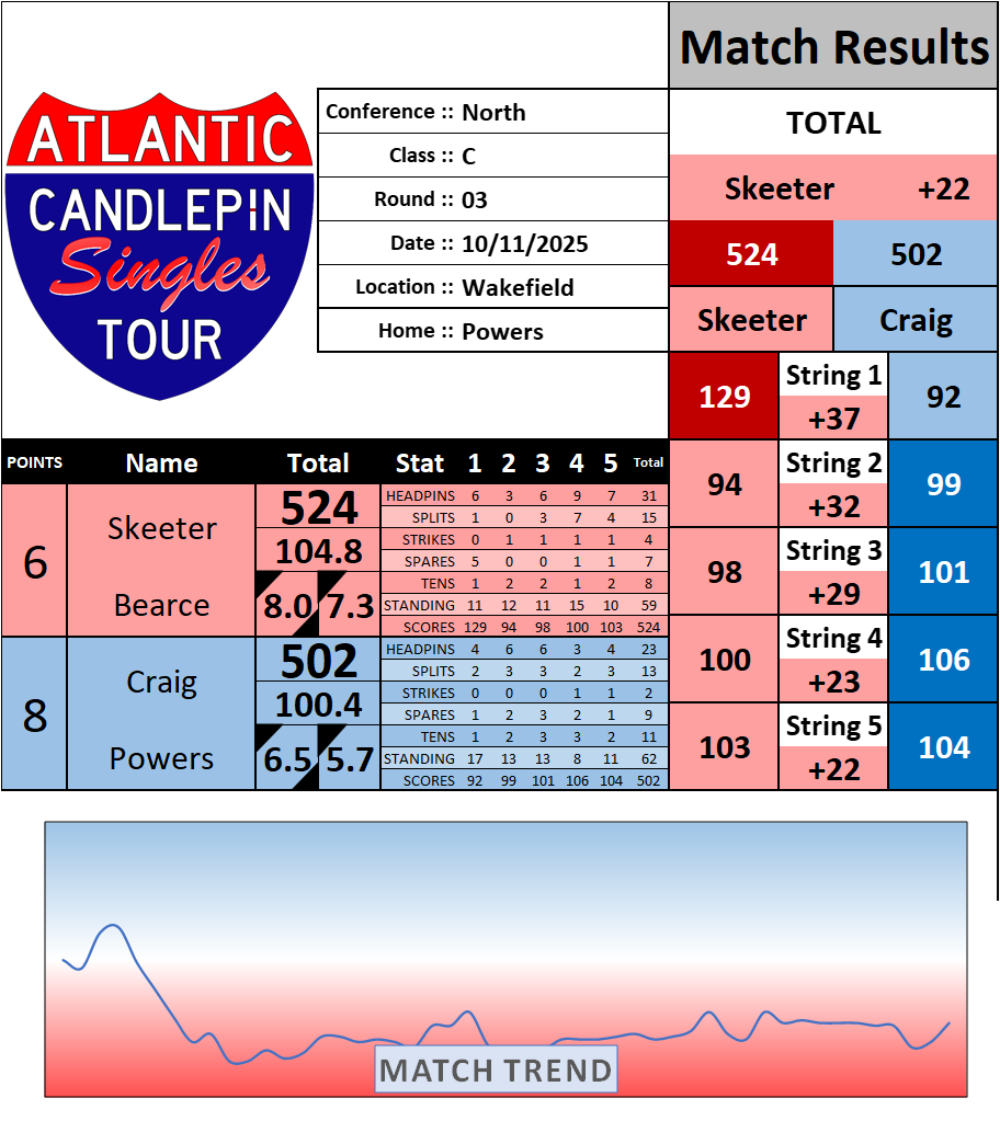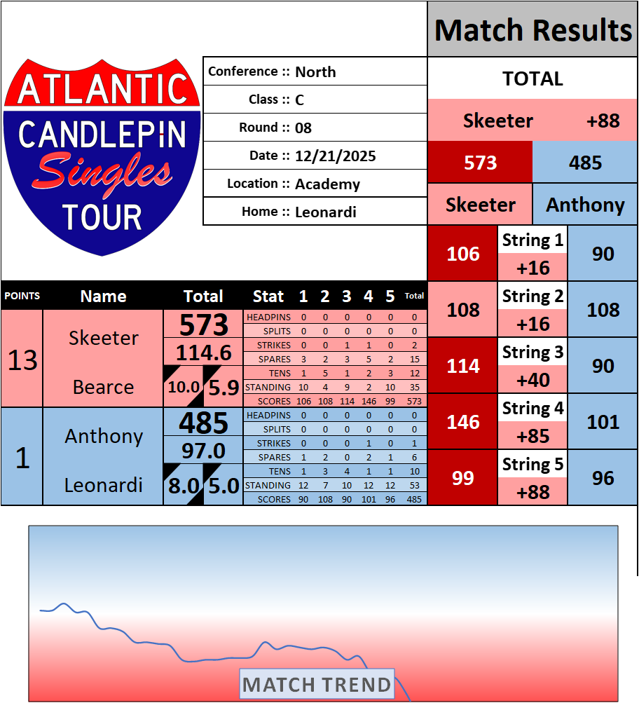 Browse the folder structure below to see all of the scoresheets – each is presented as two files, -1 and -2 where -1 is the Match Summary and -2 is the Scoresheet. All matches are separated by conference (North, South, West), and class (A, B, C, D, E). They are then sorted by Round # and named after the Home Bowler.