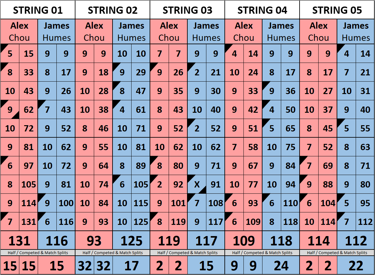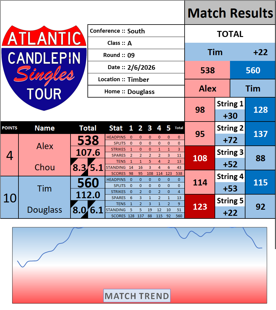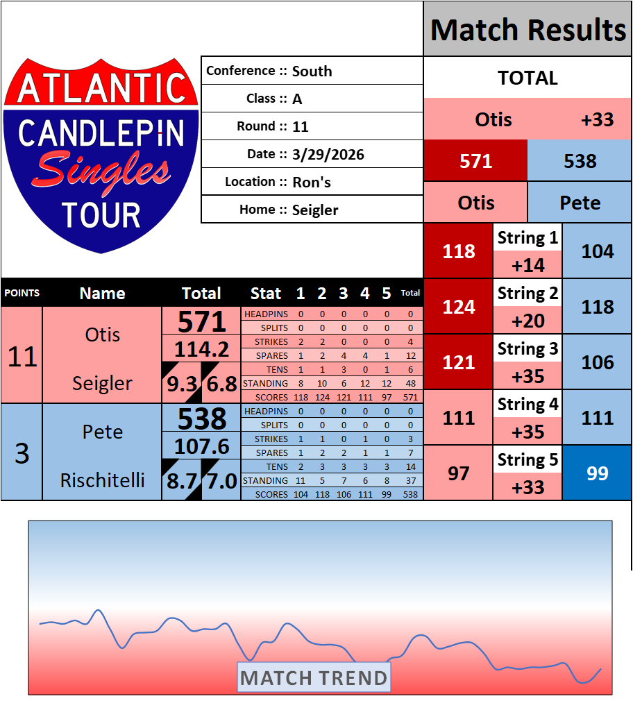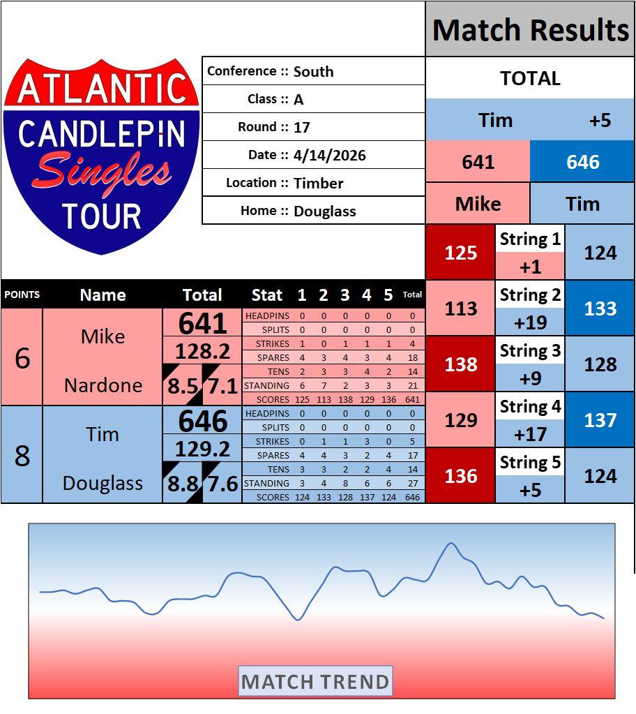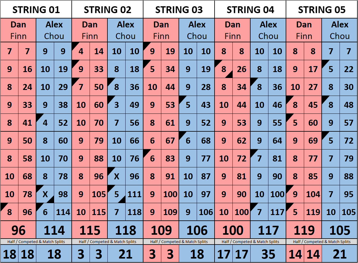 Browse the folder structure below to see all of the scoresheets – each is presented as two files, -1 and -2 where -1 is the Match Summary and -2 is the Scoresheet. All matches are separated by conference (North, South, West), and class (A, B, C, D, E). They are then sorted by Round # and named after the Home Bowler.