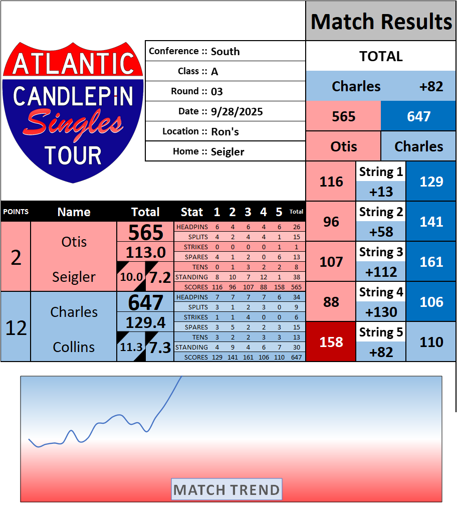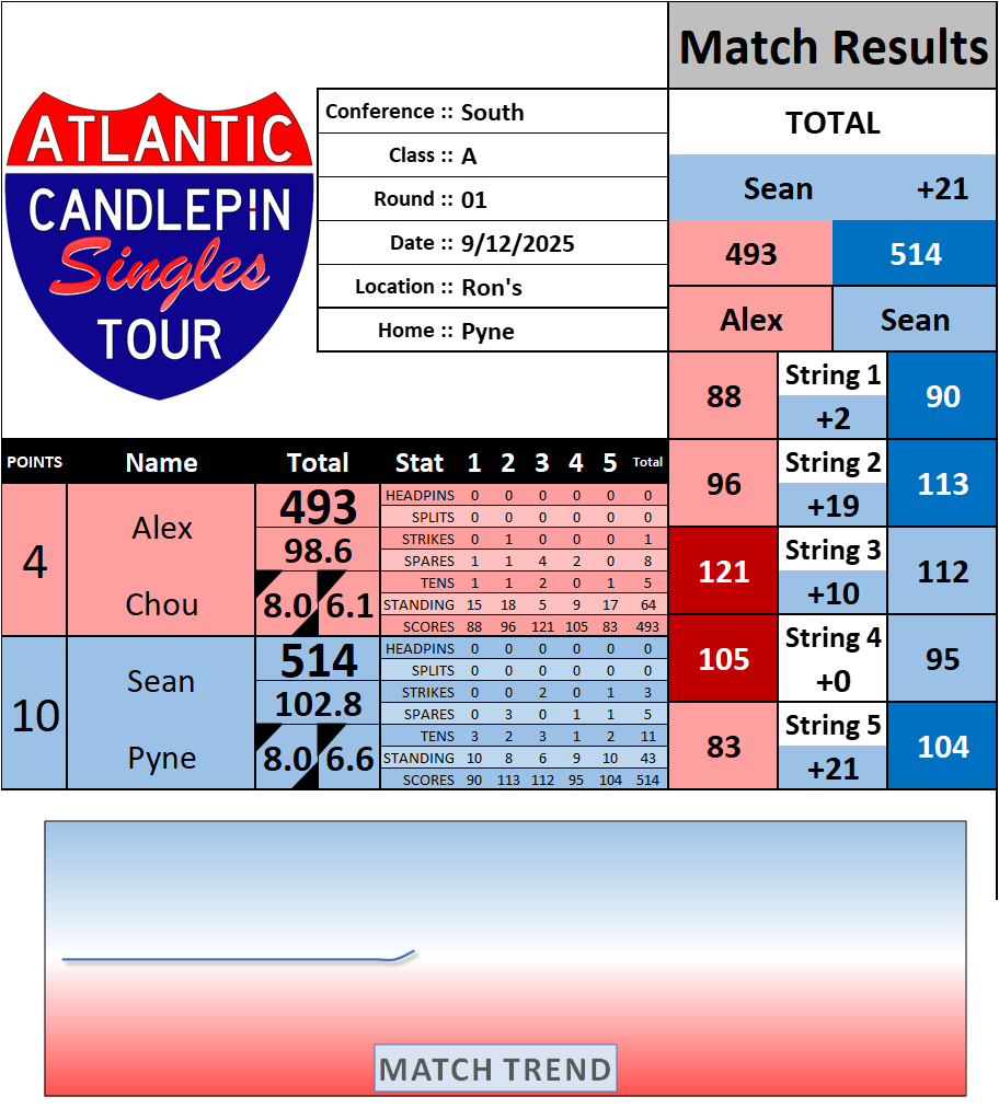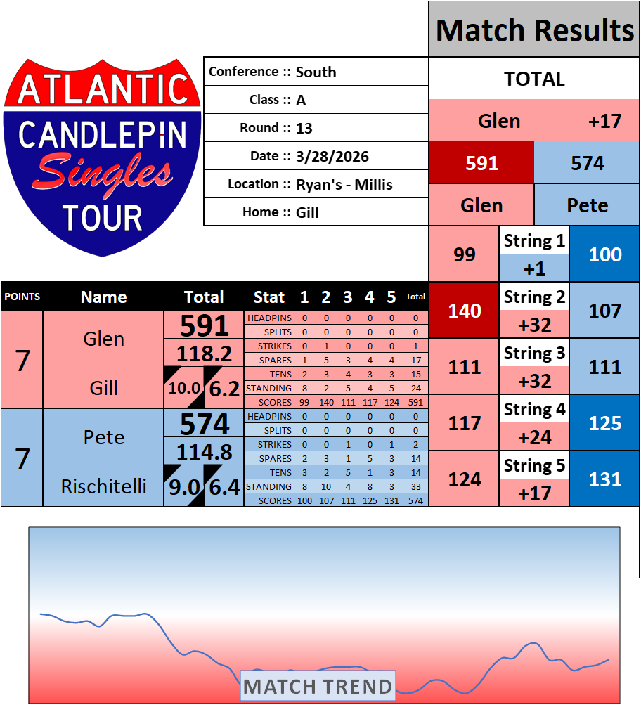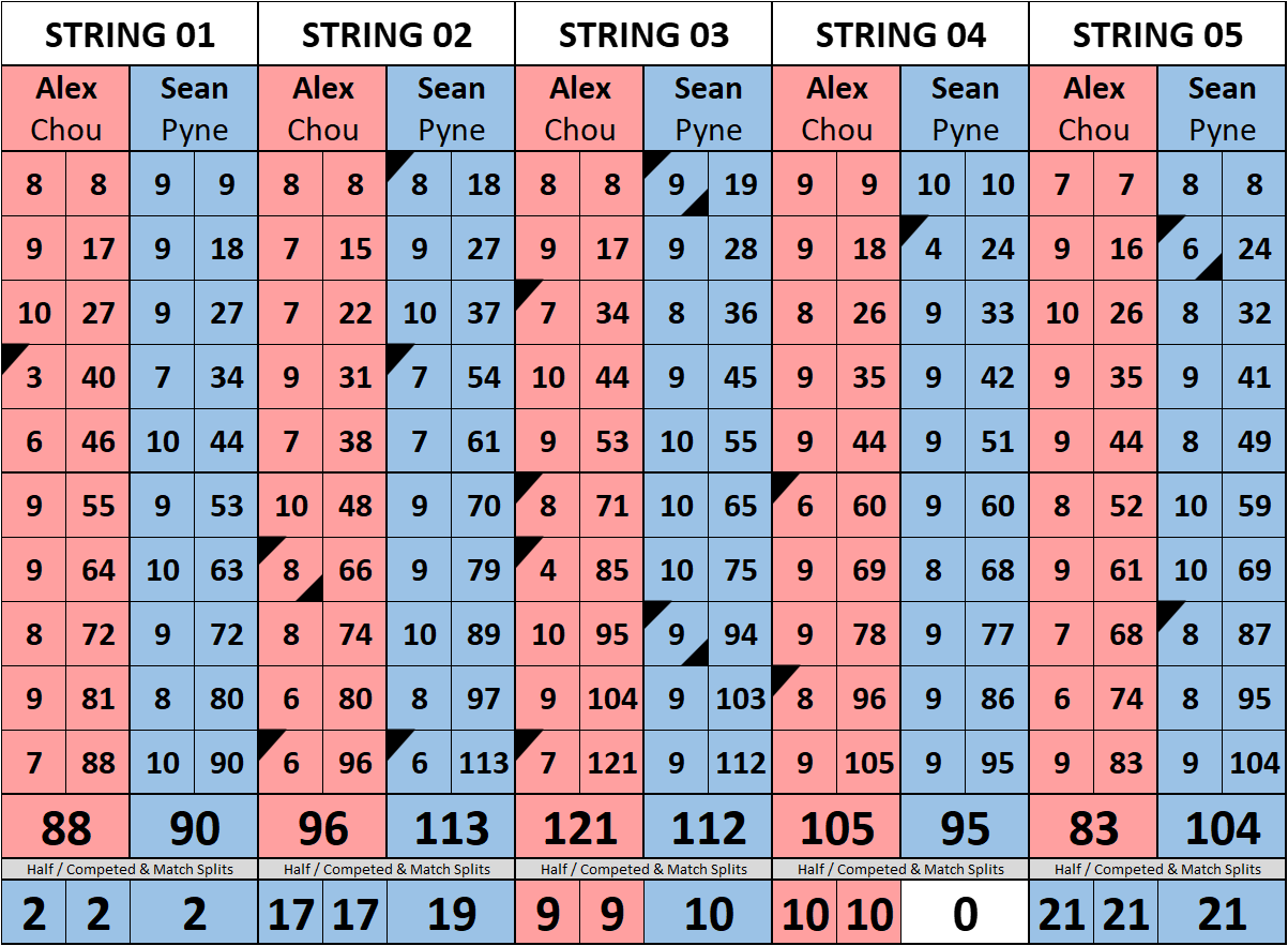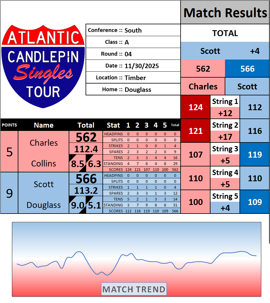 Browse the folder structure below to see all of the scoresheets – each is presented as two files, -1 and -2 where -1 is the Match Summary and -2 is the Scoresheet. All matches are separated by conference (North, South, West), and class (A, B, C, D, E). They are then sorted by Round # and named after the Home Bowler.