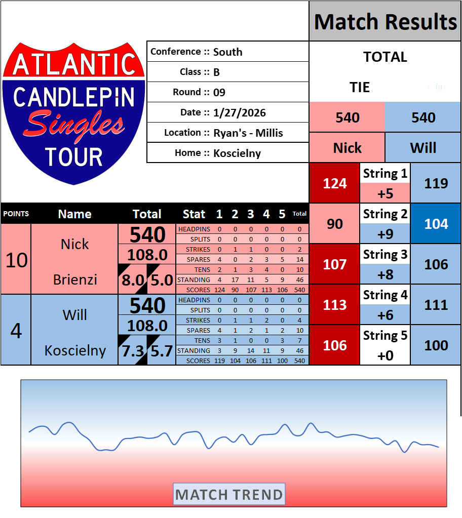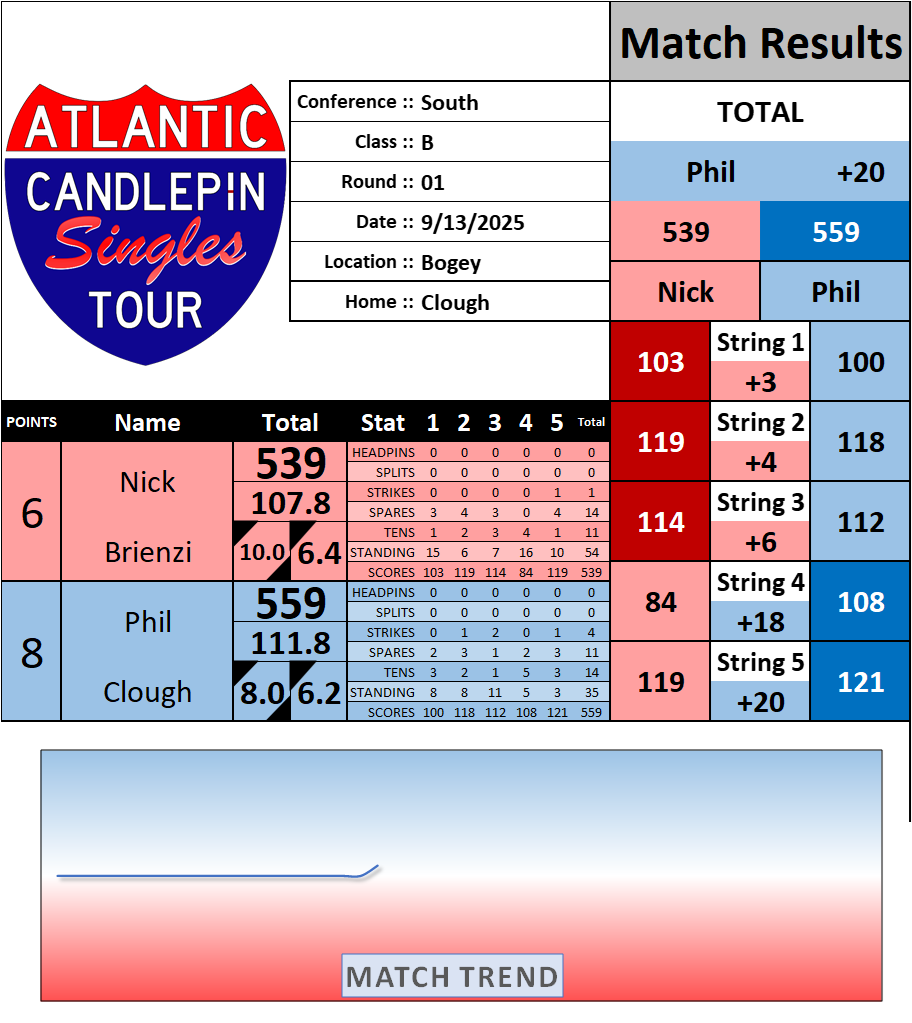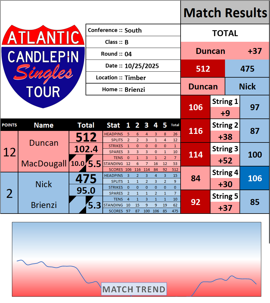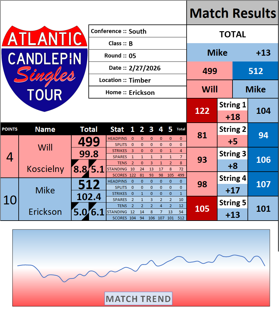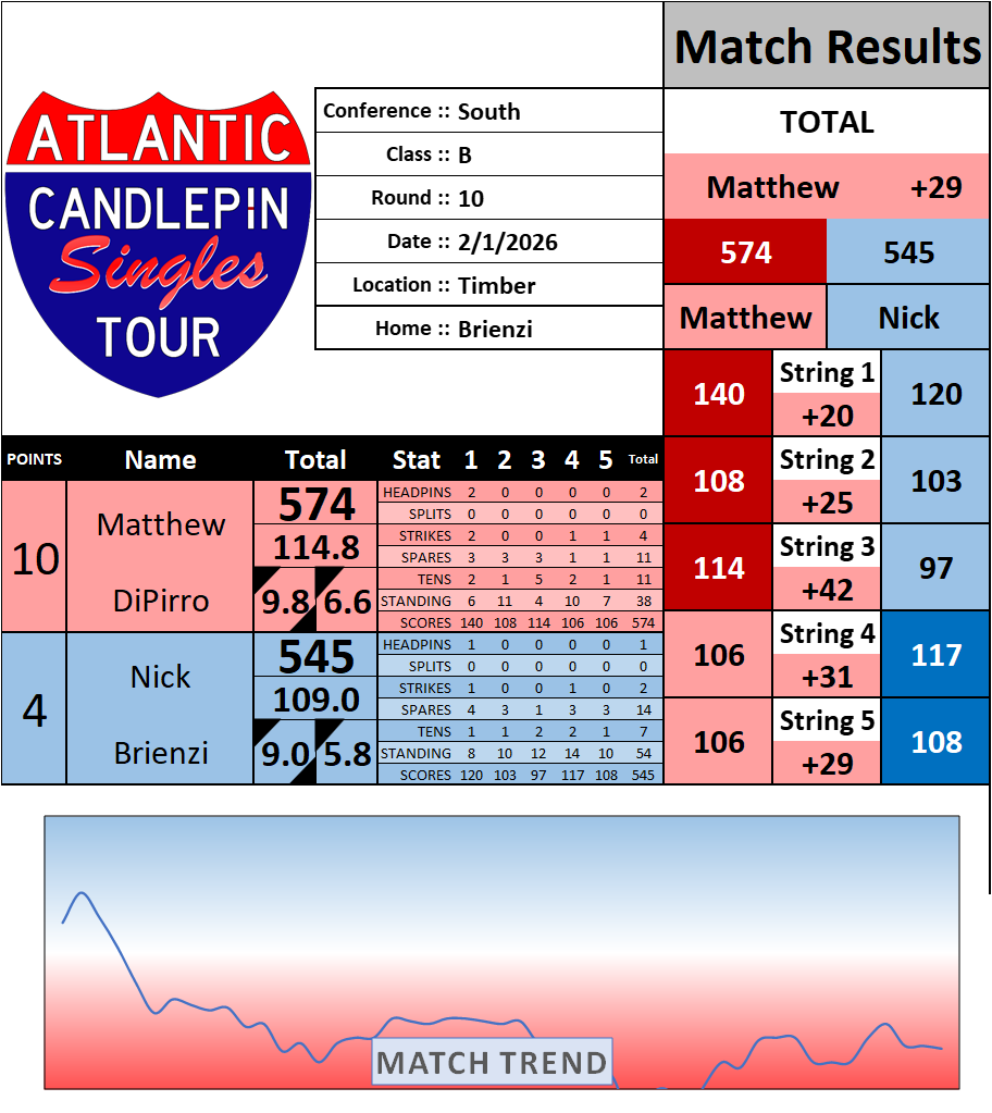 Browse the folder structure below to see all of the scoresheets – each is presented as two files, -1 and -2 where -1 is the Match Summary and -2 is the Scoresheet. All matches are separated by conference (North, South, West), and class (A, B, C, D, E). They are then sorted by Round # and named after the Home Bowler.