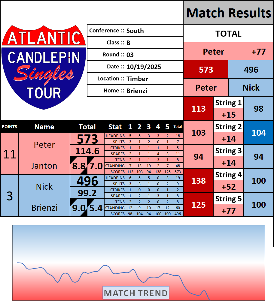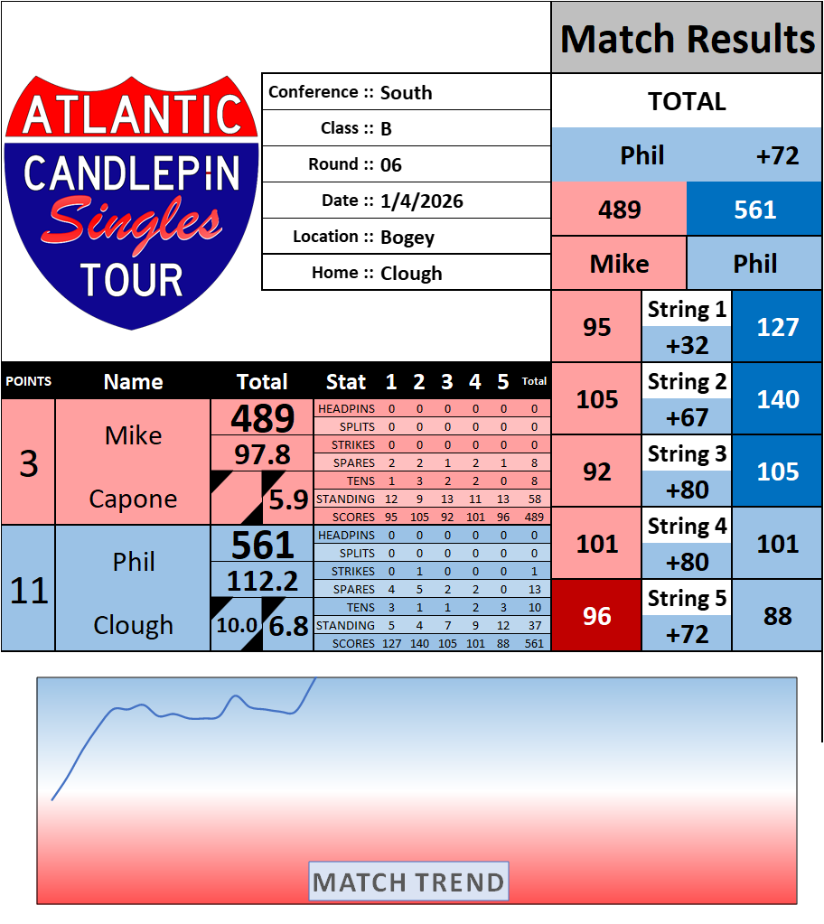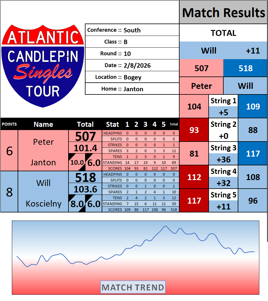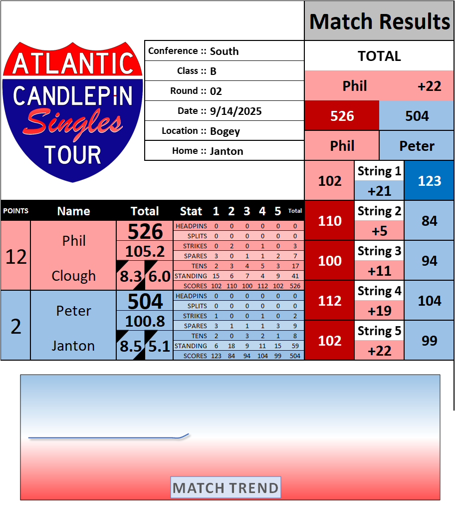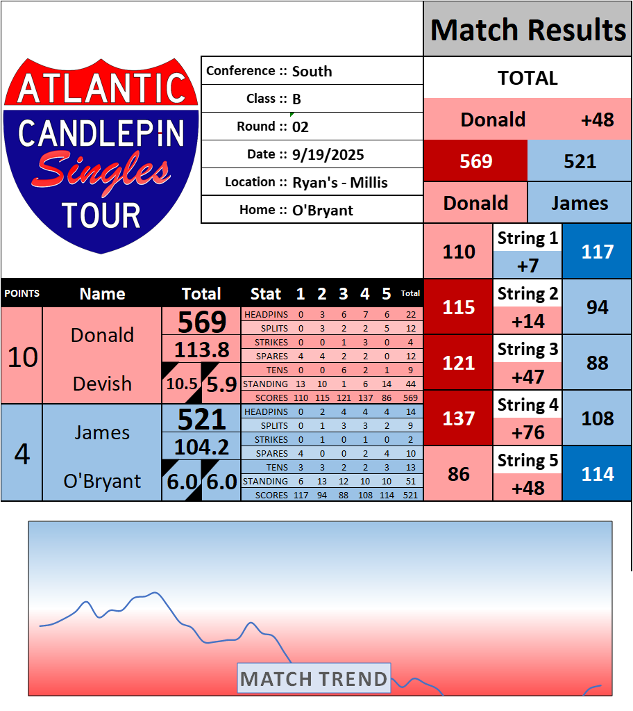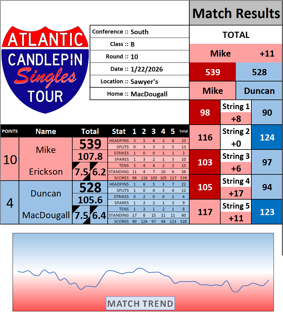 Browse the folder structure below to see all of the scoresheets – each is presented as two files, -1 and -2 where -1 is the Match Summary and -2 is the Scoresheet. All matches are separated by conference (North, South, West), and class (A, B, C, D, E). They are then sorted by Round # and named after the Home Bowler.