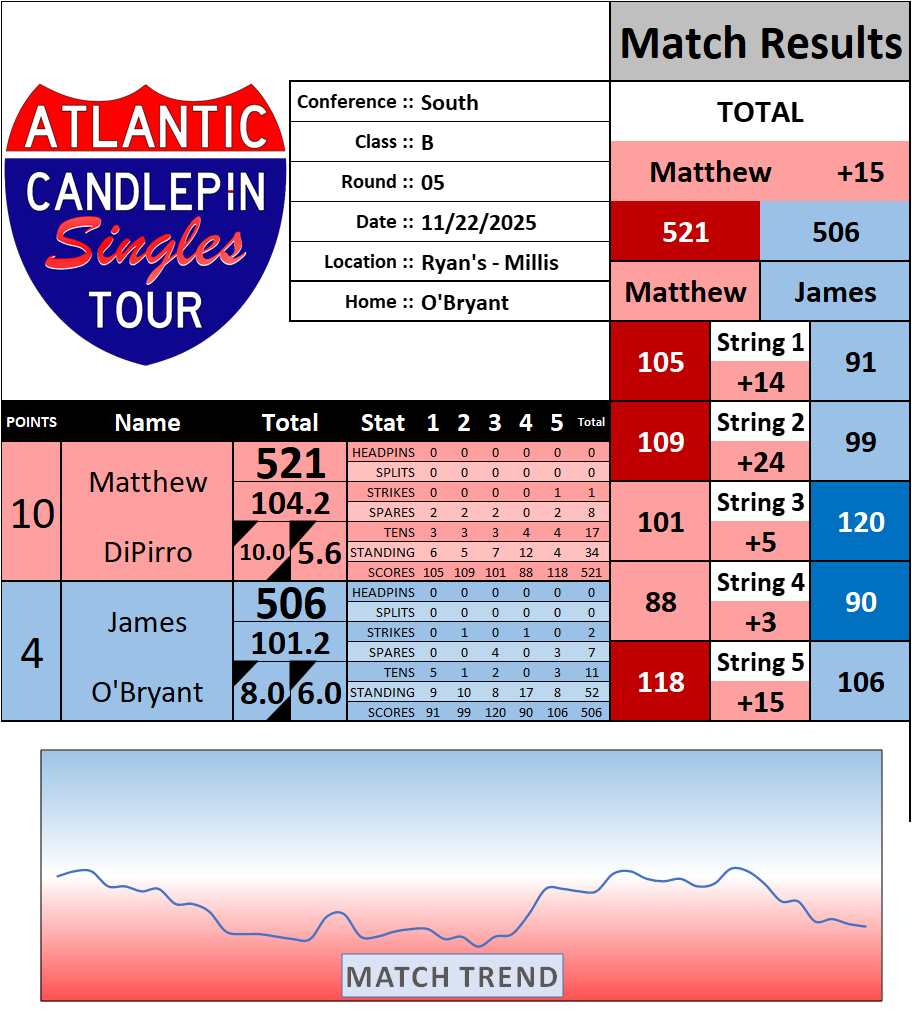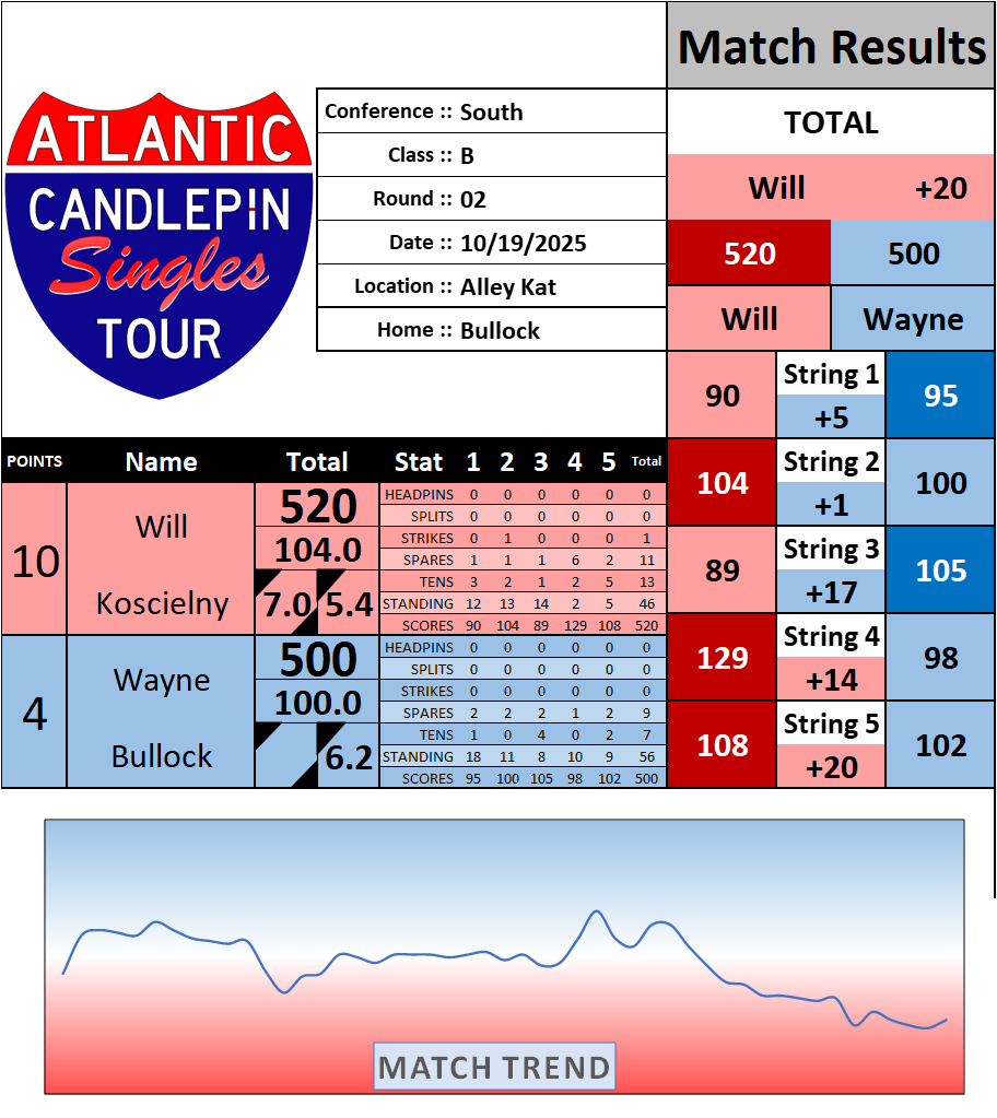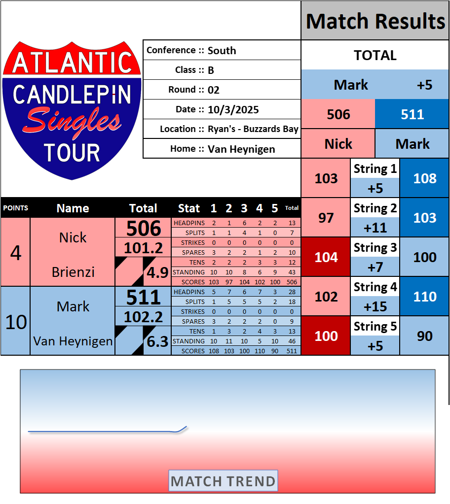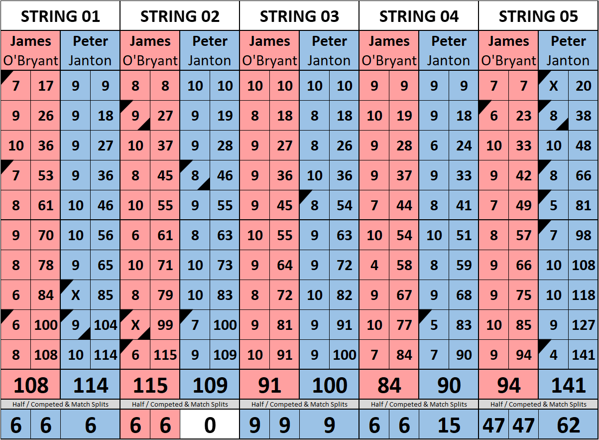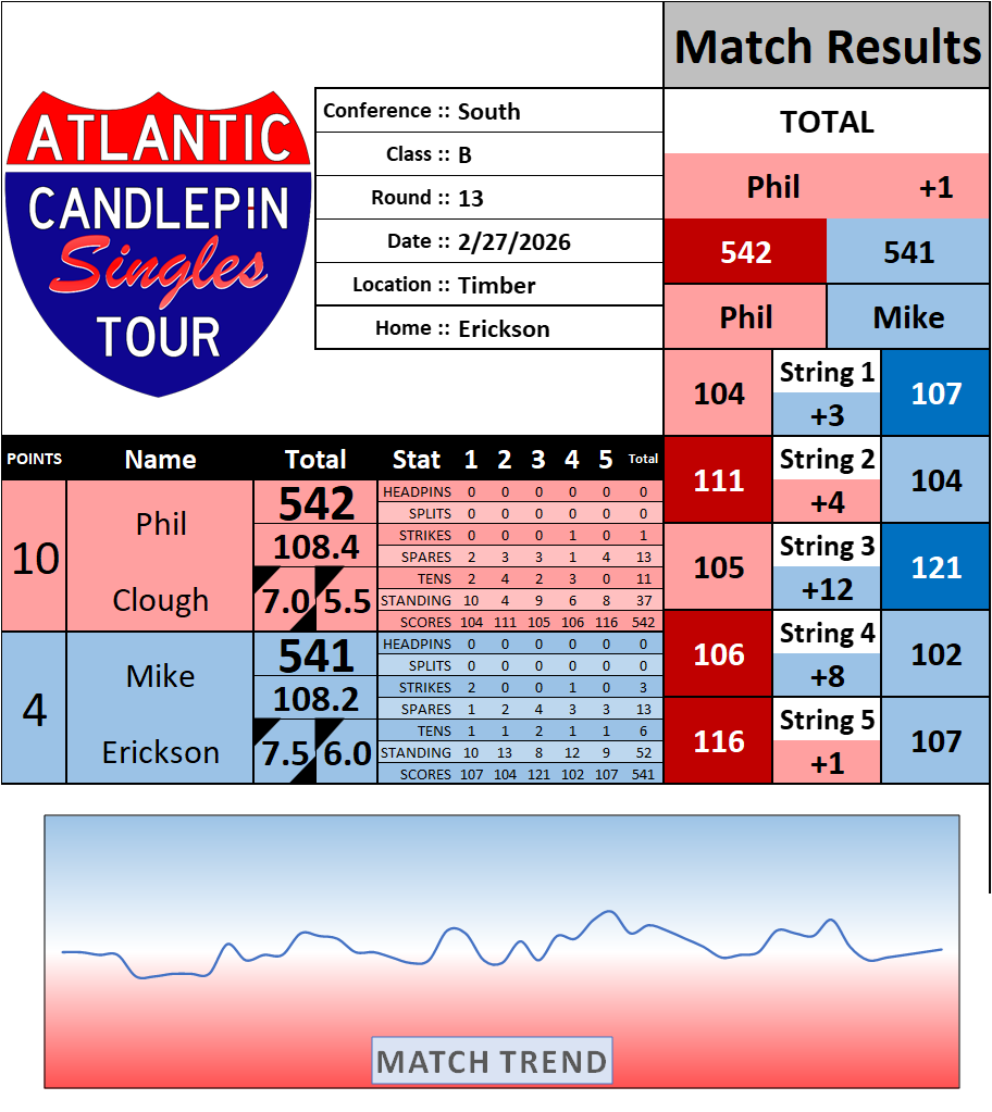 Browse the folder structure below to see all of the scoresheets – each is presented as two files, -1 and -2 where -1 is the Match Summary and -2 is the Scoresheet. All matches are separated by conference (North, South, West), and class (A, B, C, D, E). They are then sorted by Round # and named after the Home Bowler.