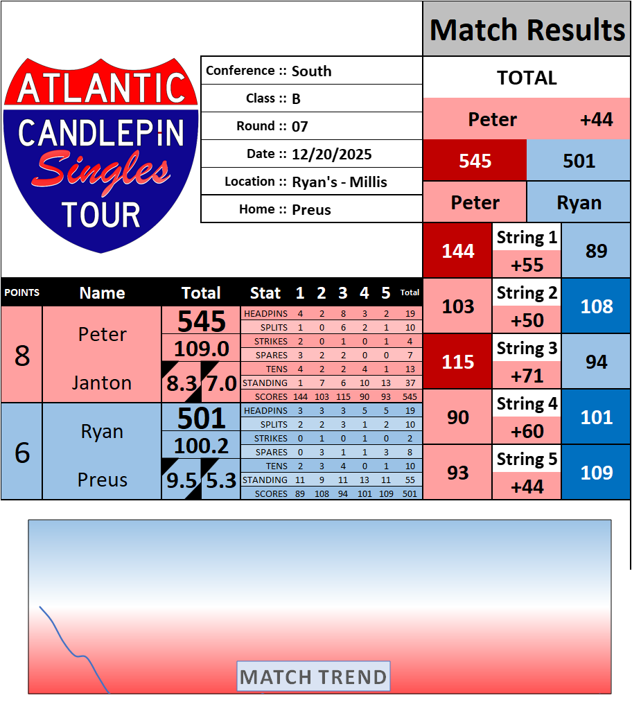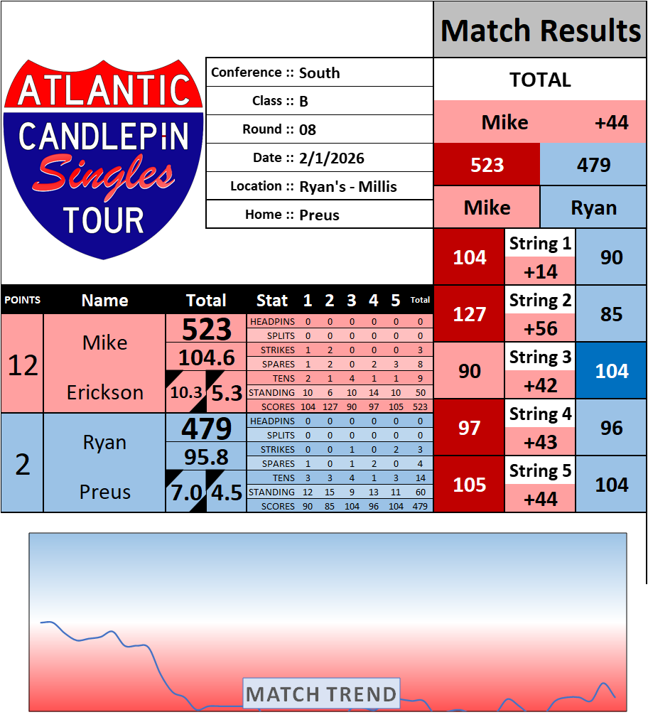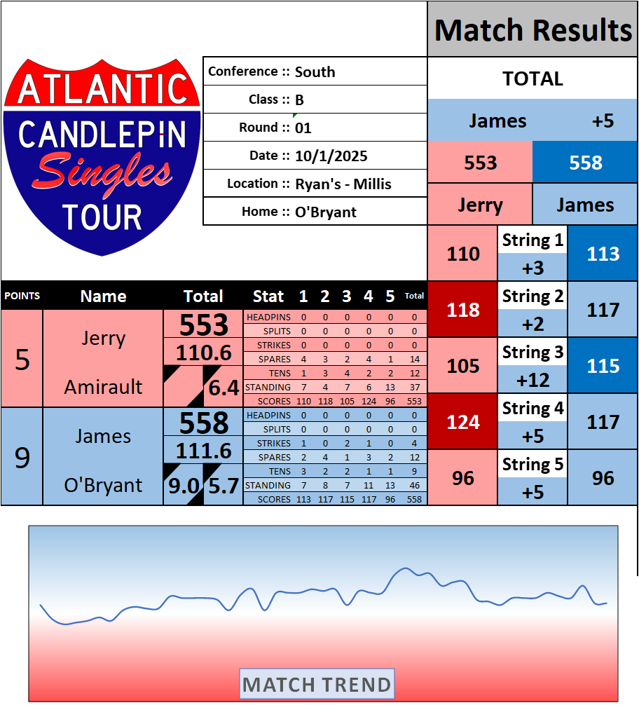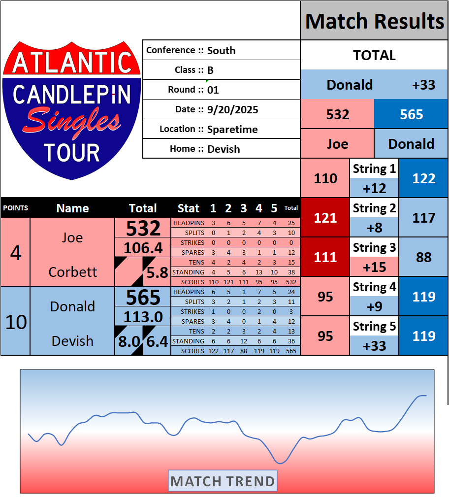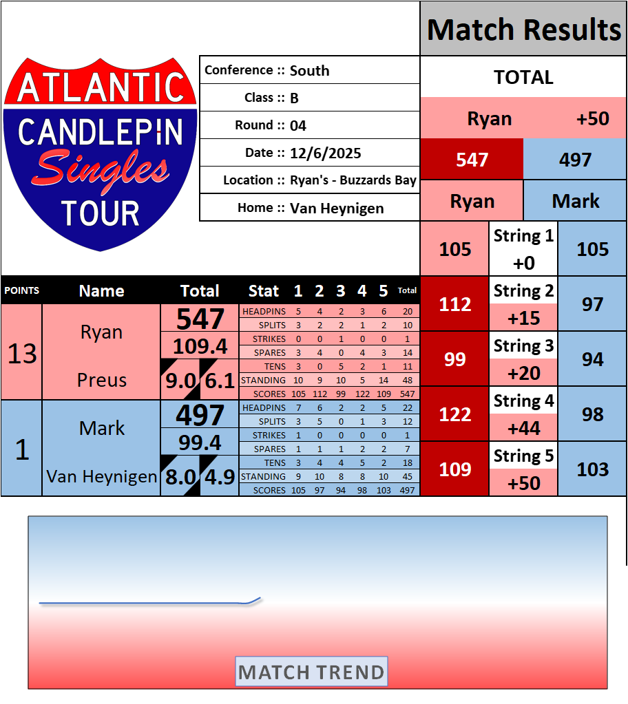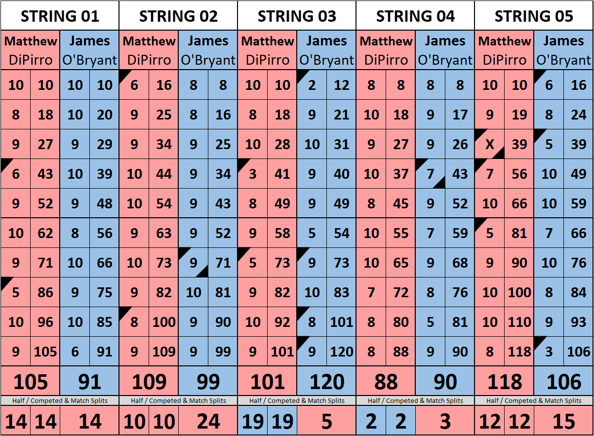 Browse the folder structure below to see all of the scoresheets – each is presented as two files, -1 and -2 where -1 is the Match Summary and -2 is the Scoresheet. All matches are separated by conference (North, South, West), and class (A, B, C, D, E). They are then sorted by Round # and named after the Home Bowler.