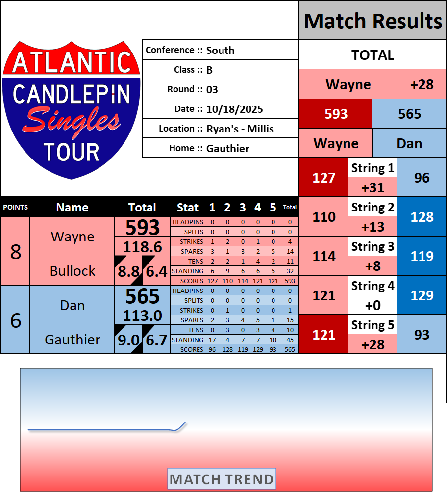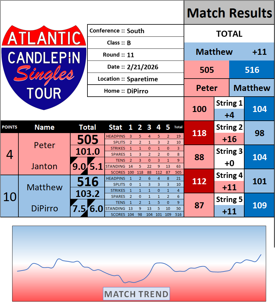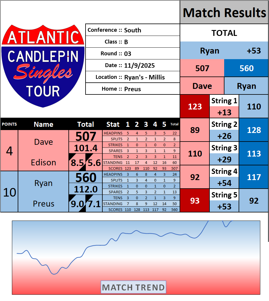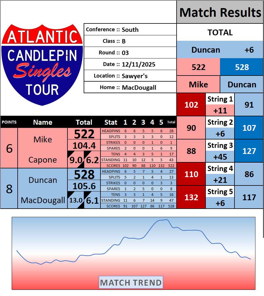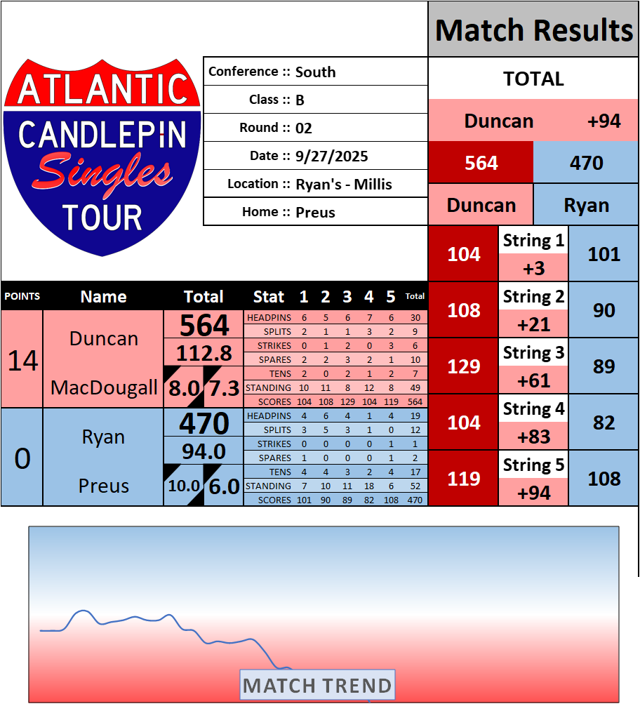 Browse the folder structure below to see all of the scoresheets – each is presented as two files, -1 and -2 where -1 is the Match Summary and -2 is the Scoresheet. All matches are separated by conference (North, South, West), and class (A, B, C, D, E). They are then sorted by Round # and named after the Home Bowler.