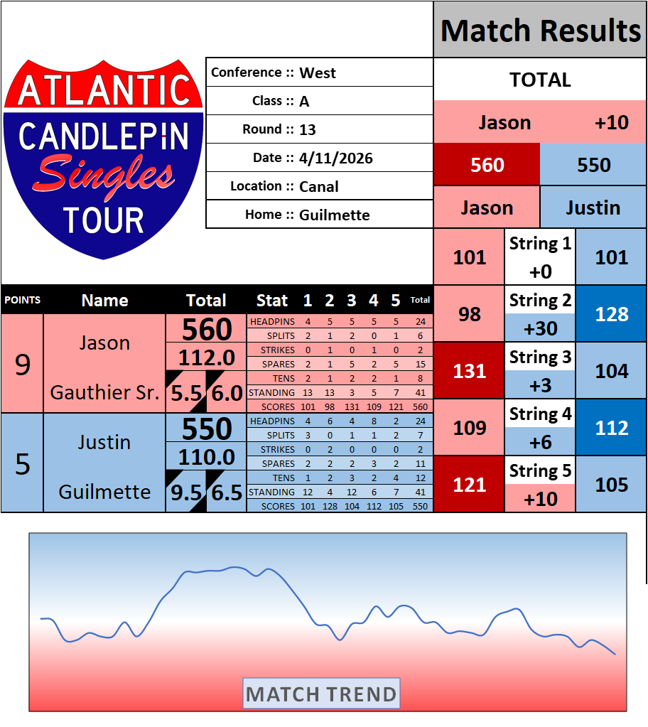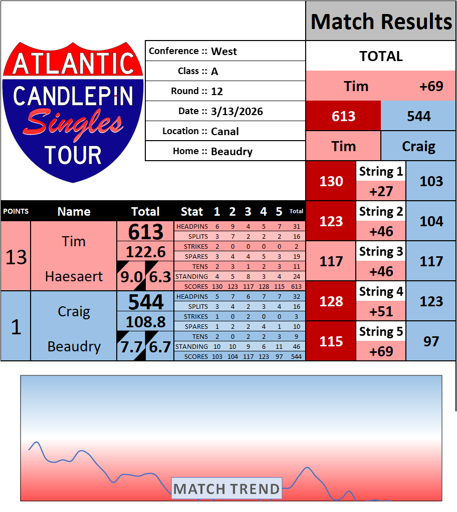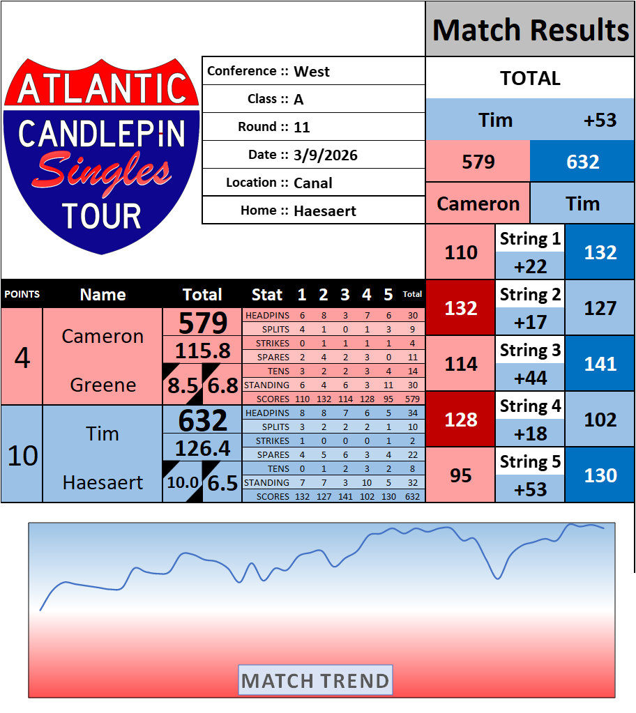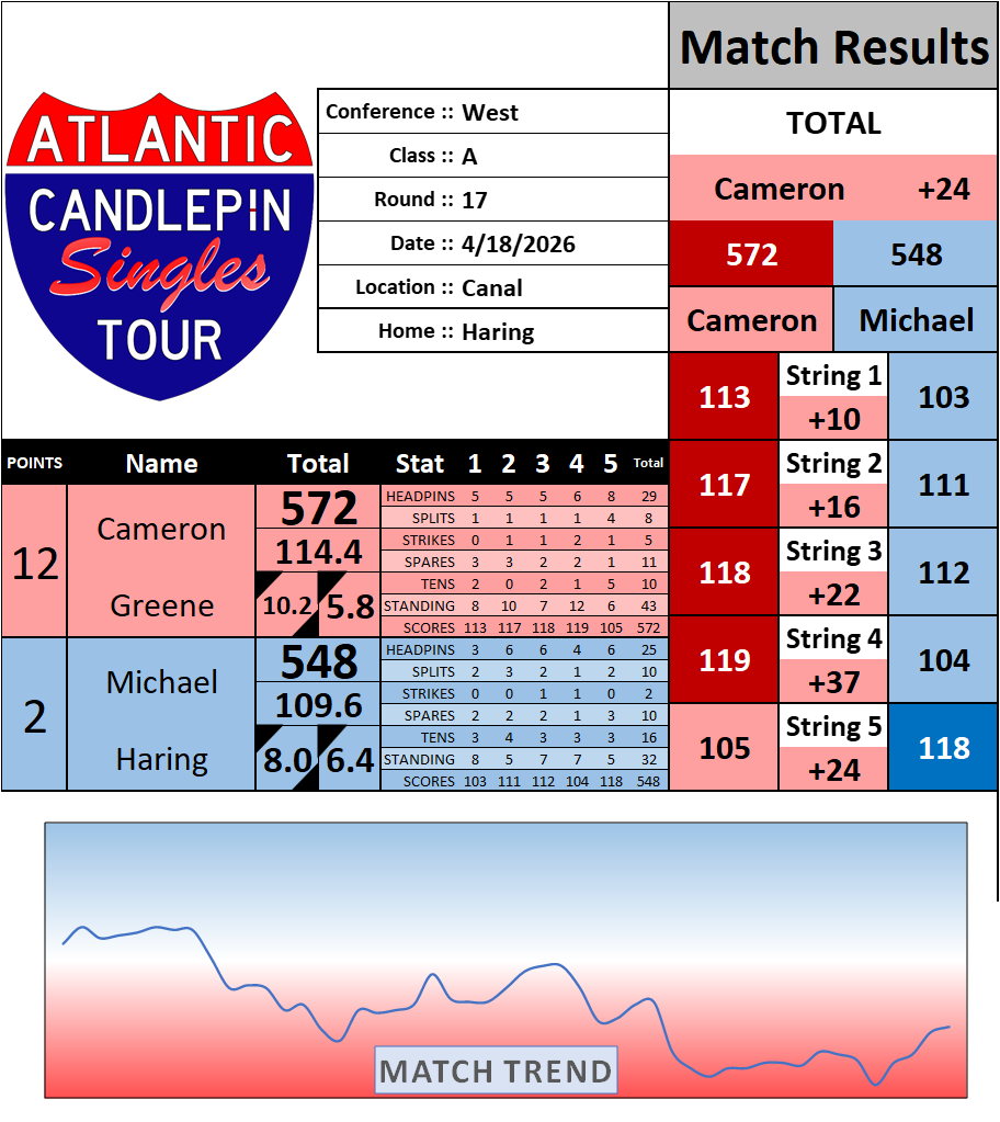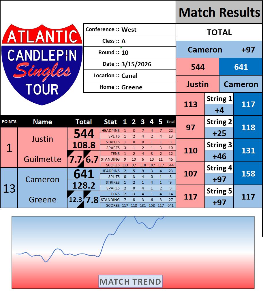Browse the folder structure below to see all of the scoresheets – each is presented as two files, -1 and -2 where -1 is the Match Summary and -2 is the Scoresheet. All matches are separated by conference (North, South, West), and class (A, B, C, D, E). They are then sorted by Round # and named after the Home Bowler.