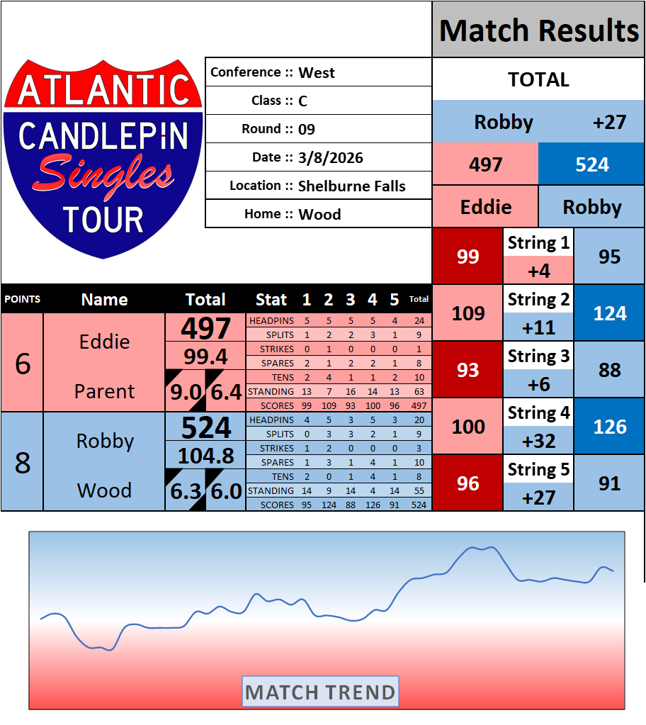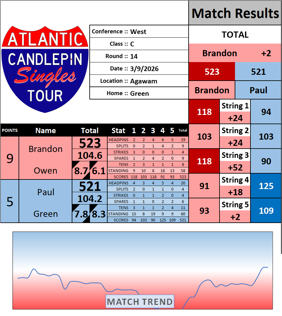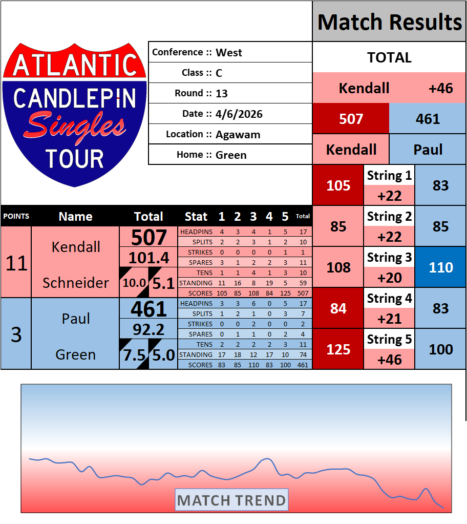 Browse the folder structure below to see all of the scoresheets – each is presented as two files, -1 and -2 where -1 is the Match Summary and -2 is the Scoresheet. All matches are separated by conference (North, South, West), and class (A, B, C, D, E). They are then sorted by Round # and named after the Home Bowler.